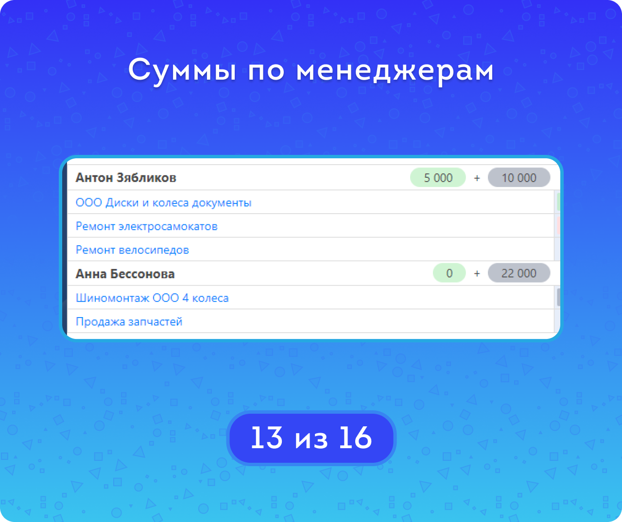 Приложение помогает не только изучить статистику оплат за предыдущие периоды, но и запланировать доходы. Если у вас несколько менеджеров и большое количество клиентов, то предсказать, когда и сколько денег вы получите не так-то просто. А ведь данные о планируемых оплатах уже есть в CRM, только в разрозненном виде.