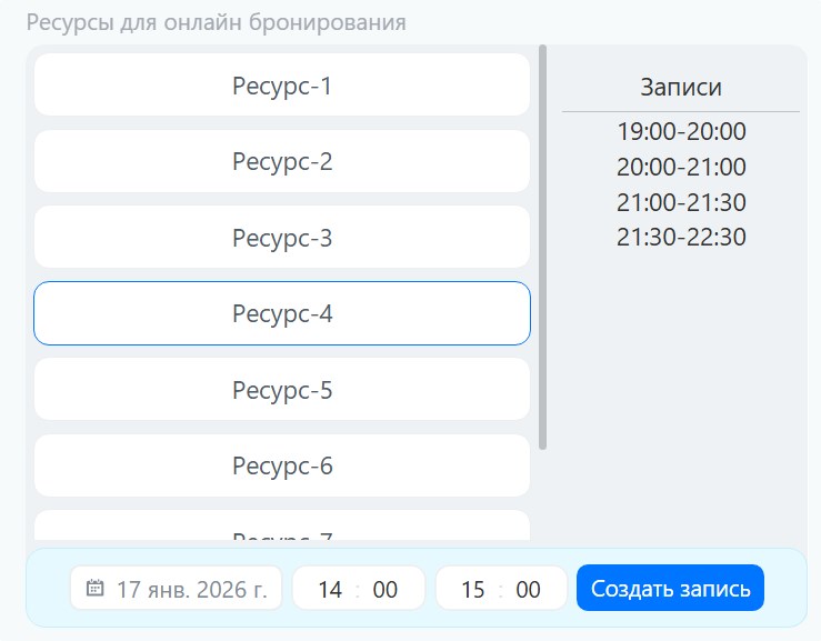 - Для бронирования ресурсов (переговорных, оборудования, специалистов)