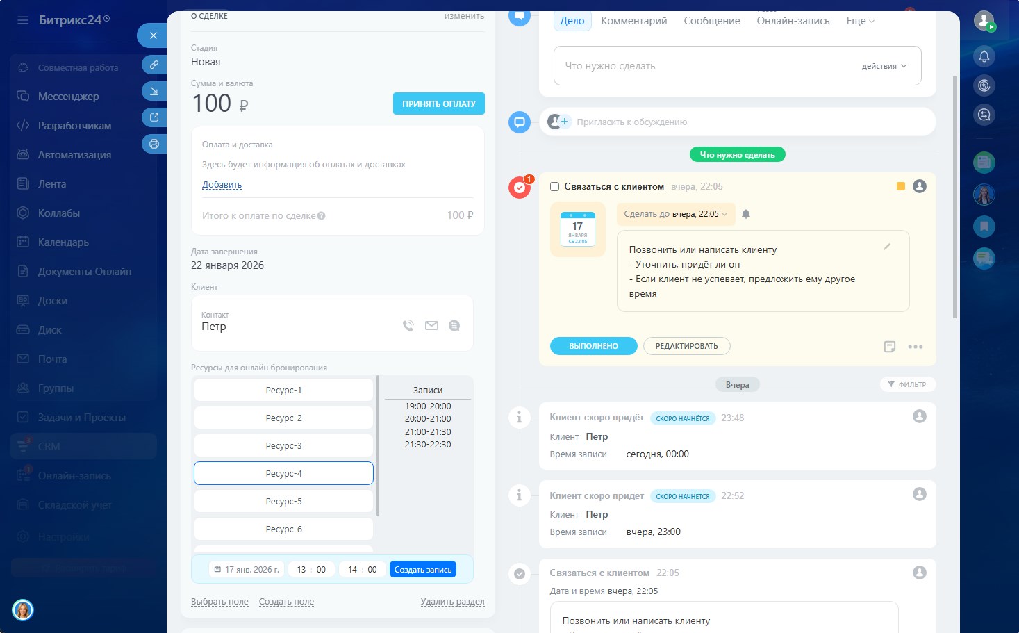 - Выгода: Интеграция управления ресурсами непосредственно в карточку сделки, автоматическая привязка бронирований к сделкам, визуальное отображение доступности ресурсов