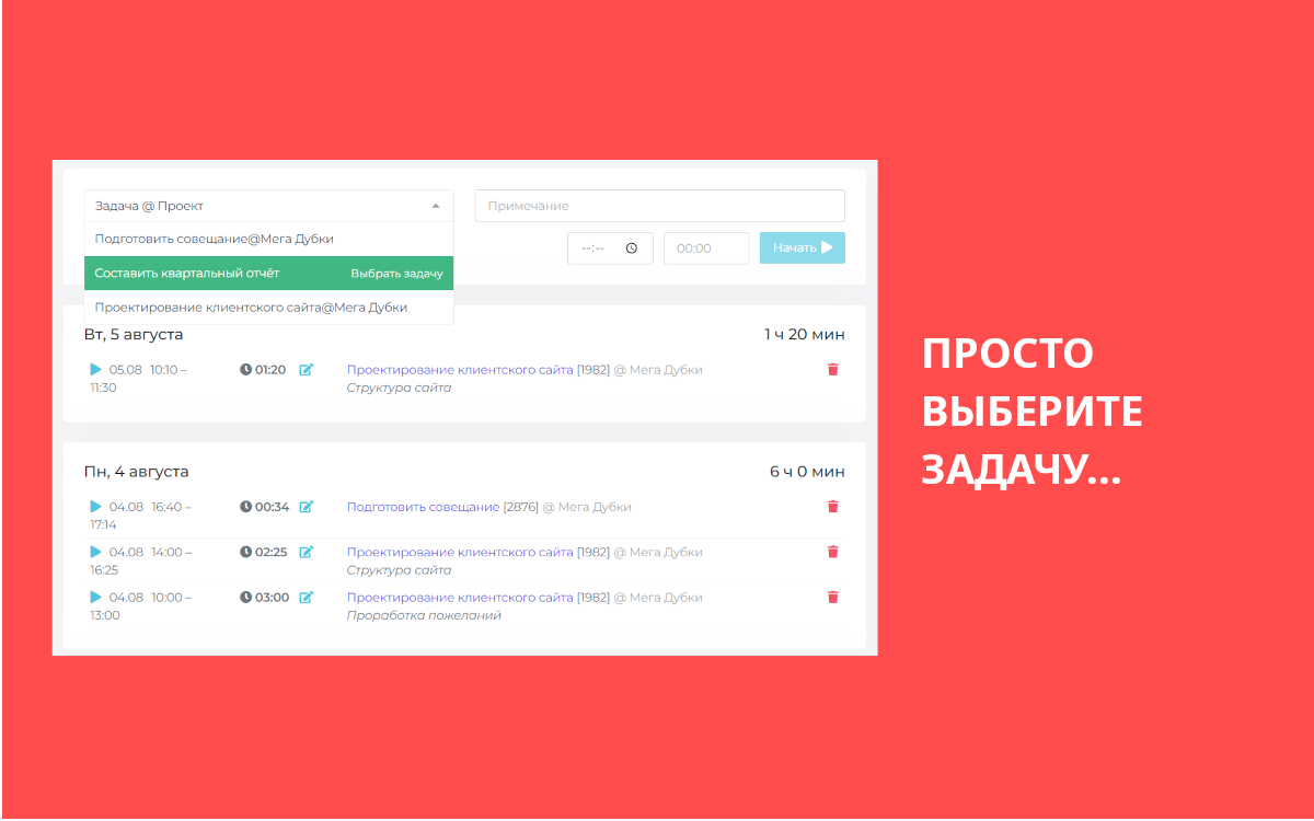 В приложении нет ничего лишнего: тайминг запускается очень просто - достаточно выбрать задачу, для которой необходимо зафиксировать затраченное время.