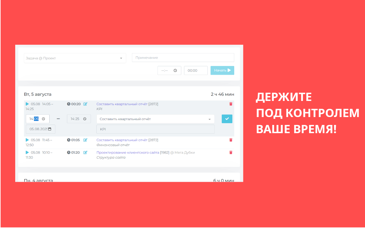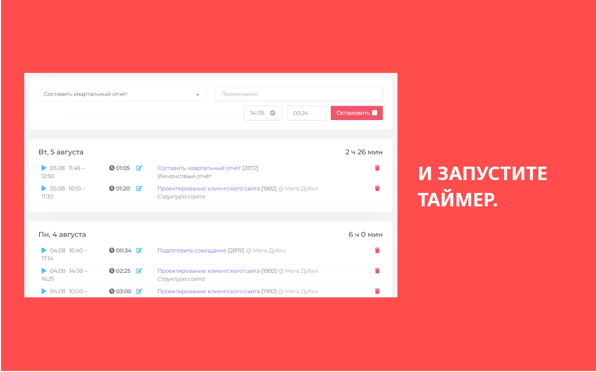 Приложение "Продуктивный учёт времени" - это удобный тайм-трекер для повседневного учёта времени вами или вашими сотрудниками.