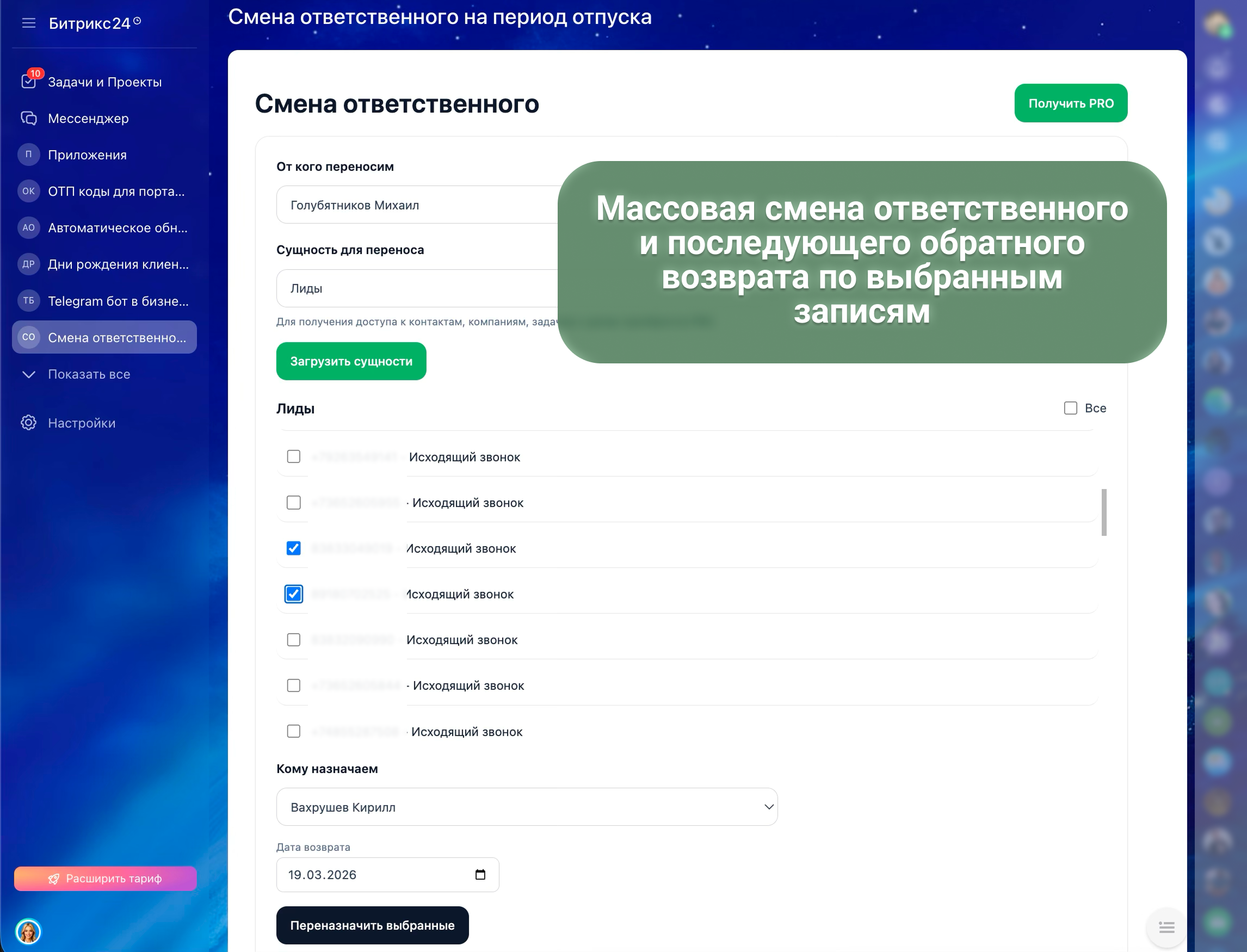 Приложение для массовой смены ответственного и последующего обратного возврата по выбранным записям.