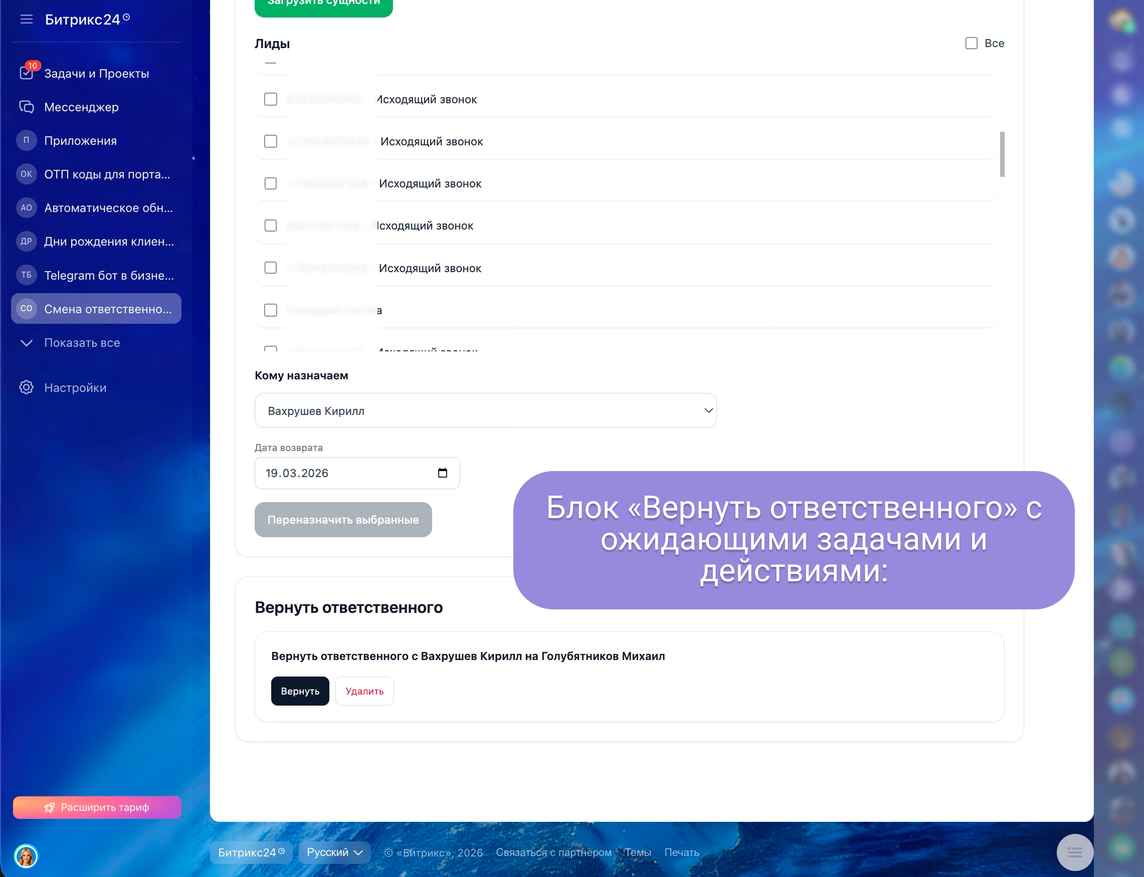 - Блок «Вернуть ответственного» с ожидающими задачами и действиями: вернуть и удалить