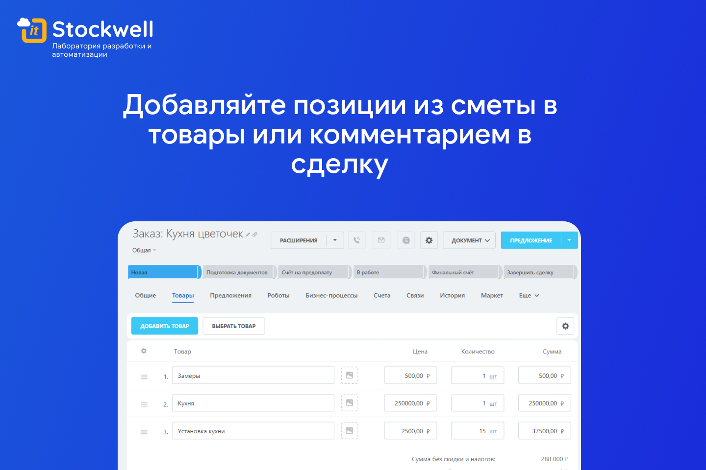 Приложение позволяет создавать смету прямо в задаче, оставлять ее как комментарий или добавлять товары в прикрепленную сделку