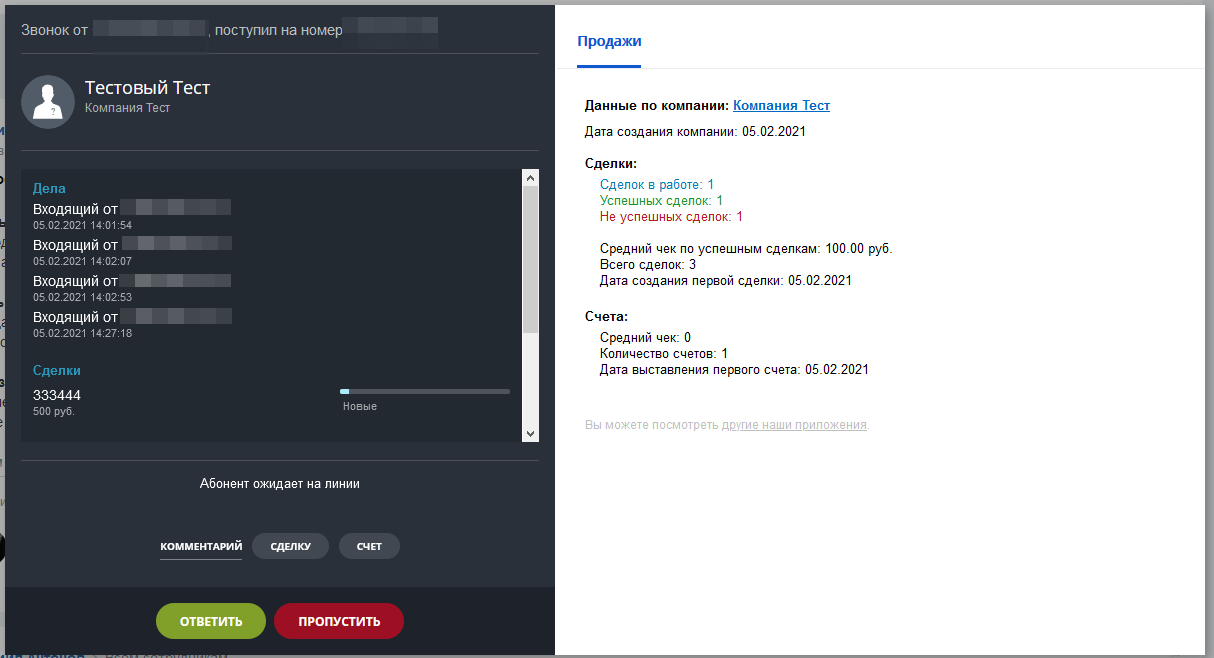 Информер выводит статистику продаж по компании при входящем и исходящем звонке. Вы сможете увидеть несколько ключевых показателей: