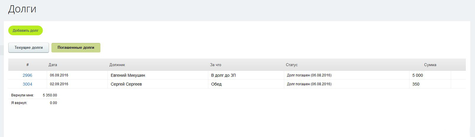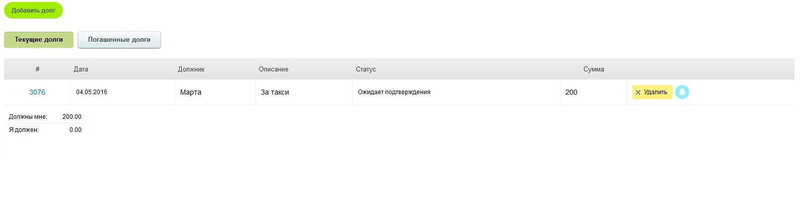 - двухстороннее подтверждение действий (возврат/запрос долга требует подтверждения обоих сторон);