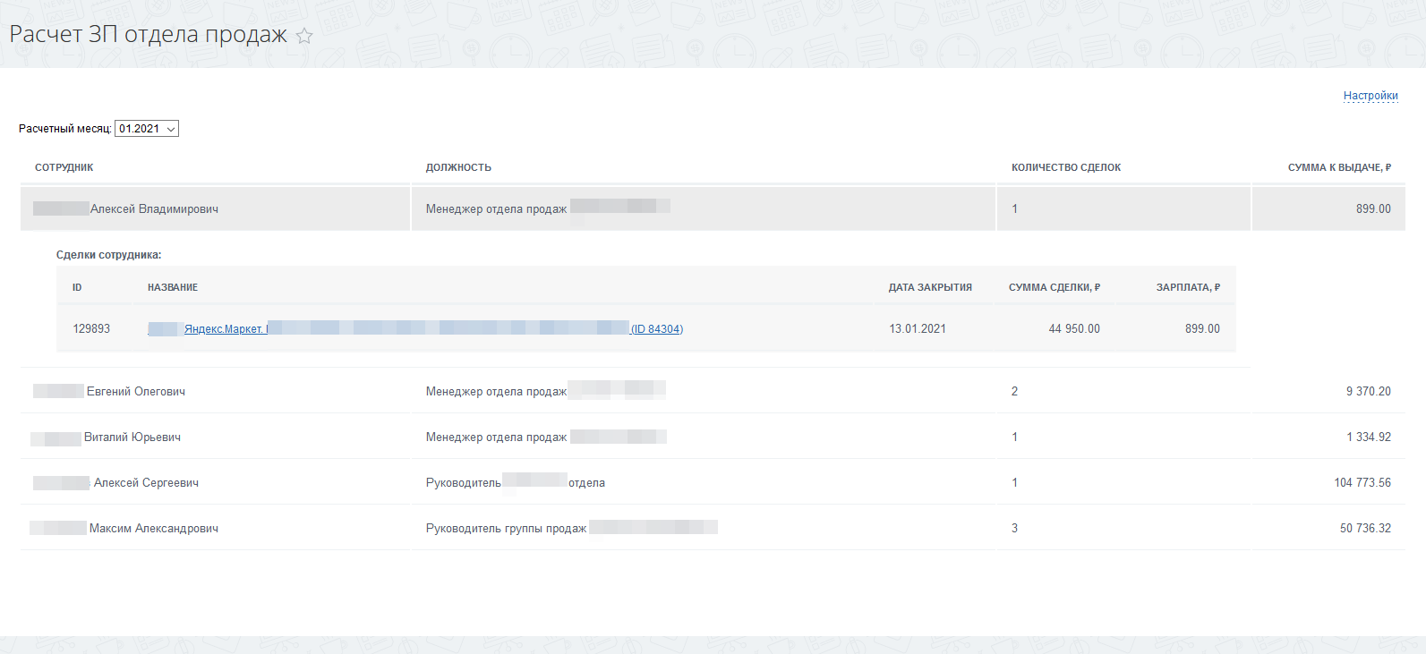 После этого приложение автоматически выберет все завершенные сделки в отчетном периоде (вы можете менять расчётный месяц через выпадающий список) и выведет сумму к выдаче по каждому сотруднику. При клике на сотрудника можно открыть расшифровку с полным перечнем всех сделок, по которым начислена бонусная часть.