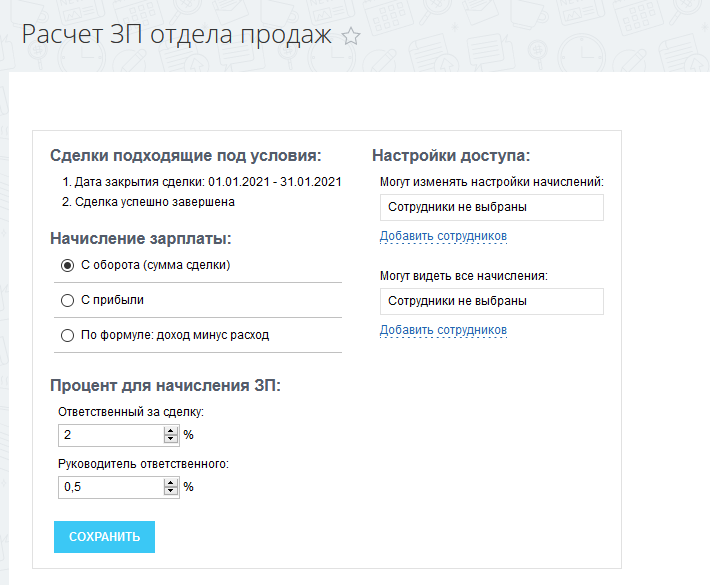 1. Необходимо выбрать каким образом рассчитывать бонусную часть зарплаты - от суммы сделки, от прибыли (если в сделке есть поле с суммой прибыли) или по формуле "сумма сделки минус расход" (если в сделке есть поле с суммой расходов по сделке).
