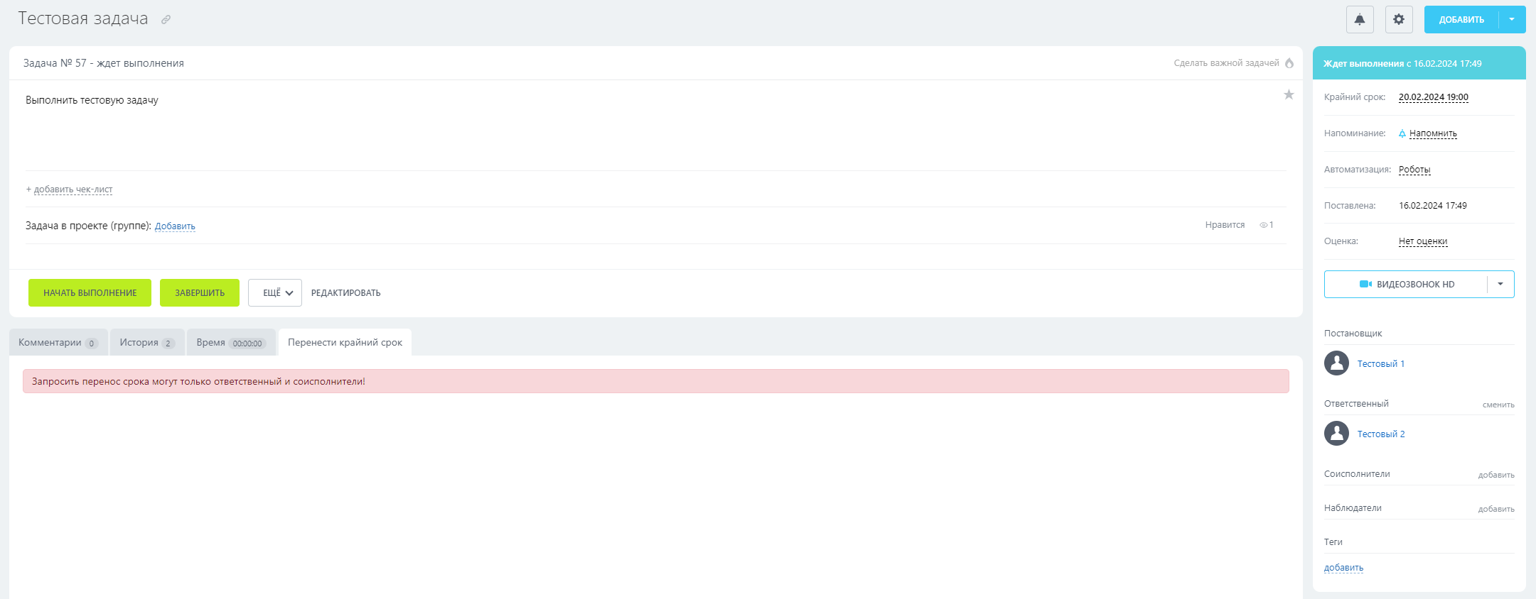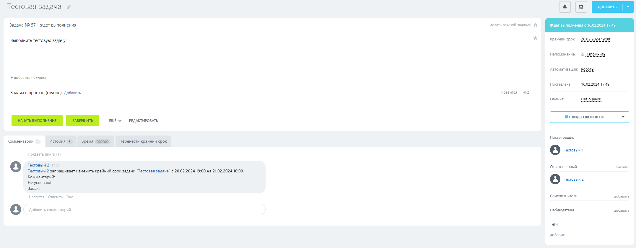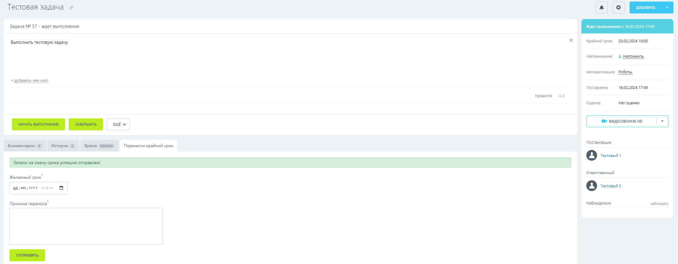 Позволяет ответственному запросить смену крайнего срока задачи.