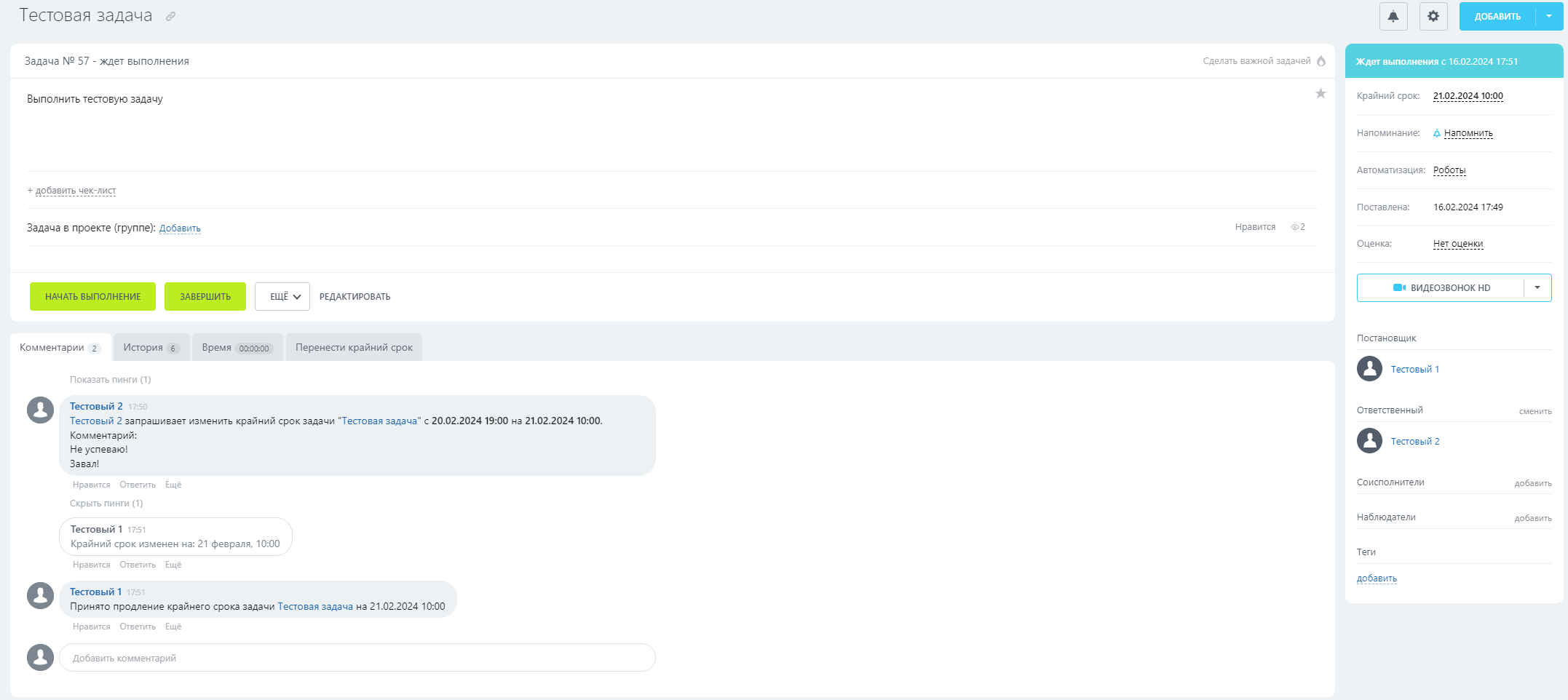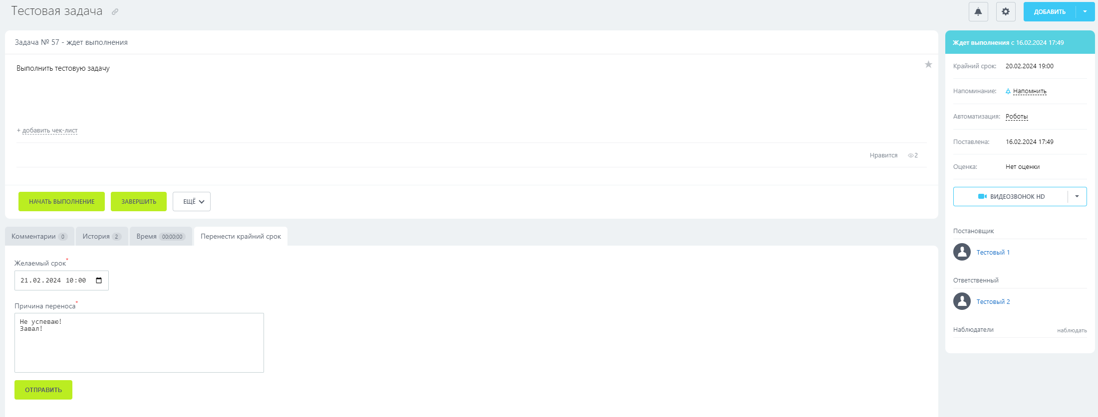 Представляем вам специальный инструмент, который гармонично вписывается в концепцию работы с задачами и позволяет быстро и удобно запросить продление сроков у постановщика.