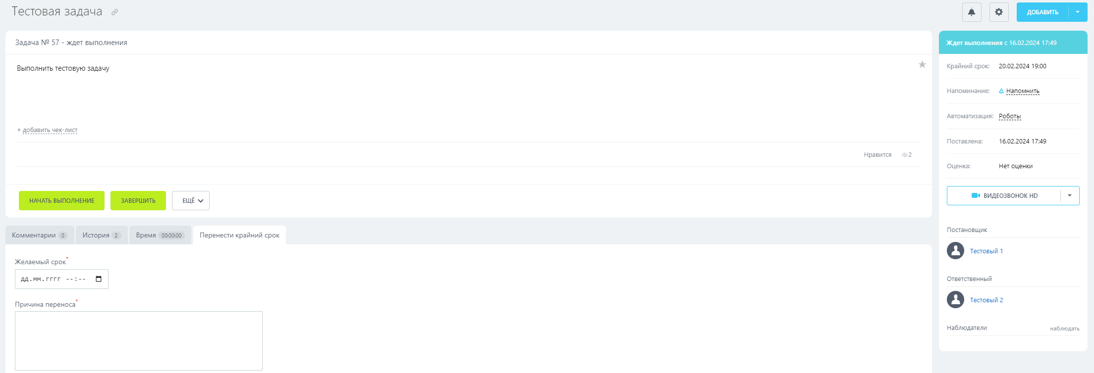 Над полем, где добавляется комментарий, появляется новая закладке "Перенести крайний срок". В нем всего 2 поля: дата-время и причина переноса.