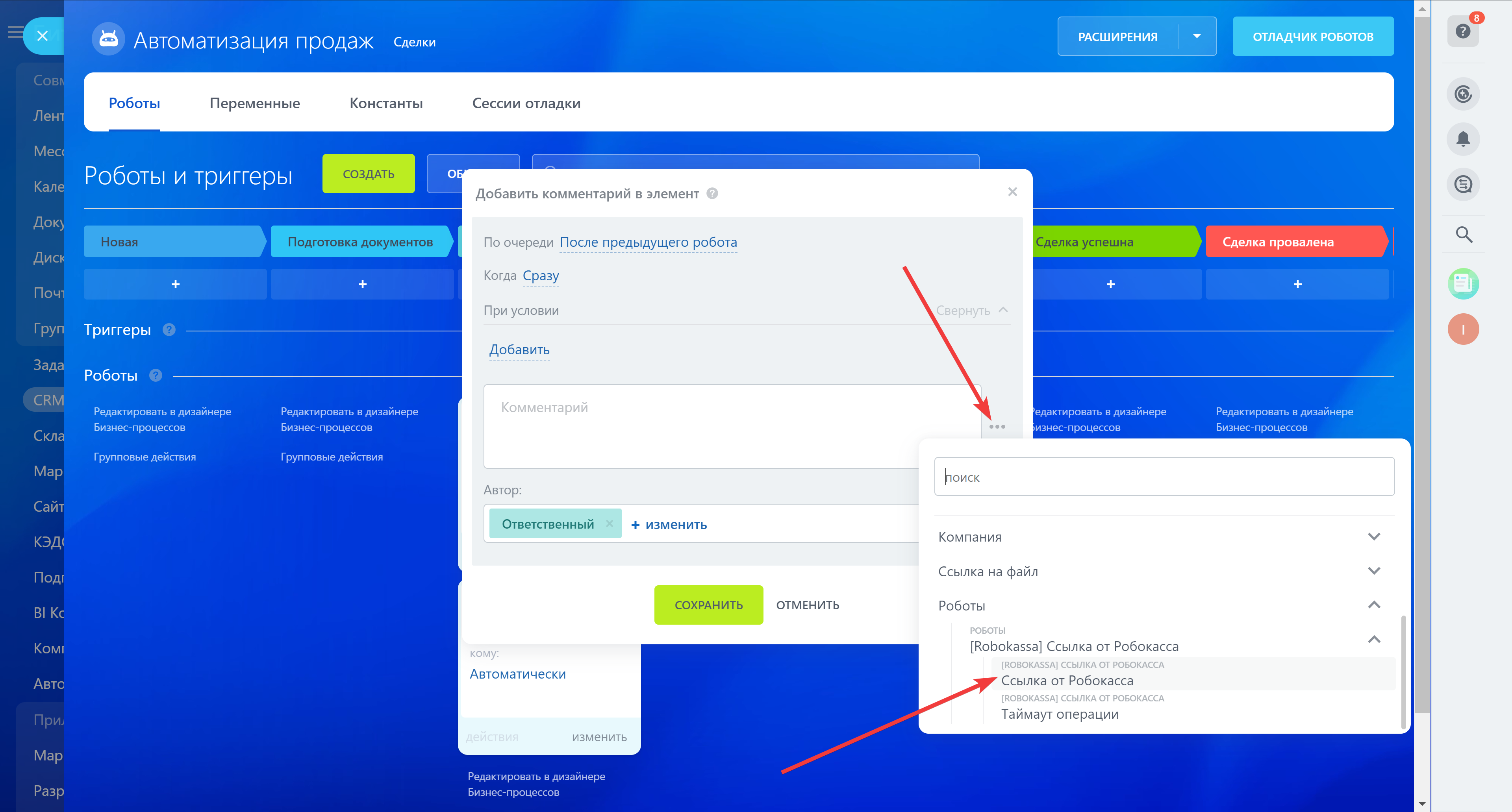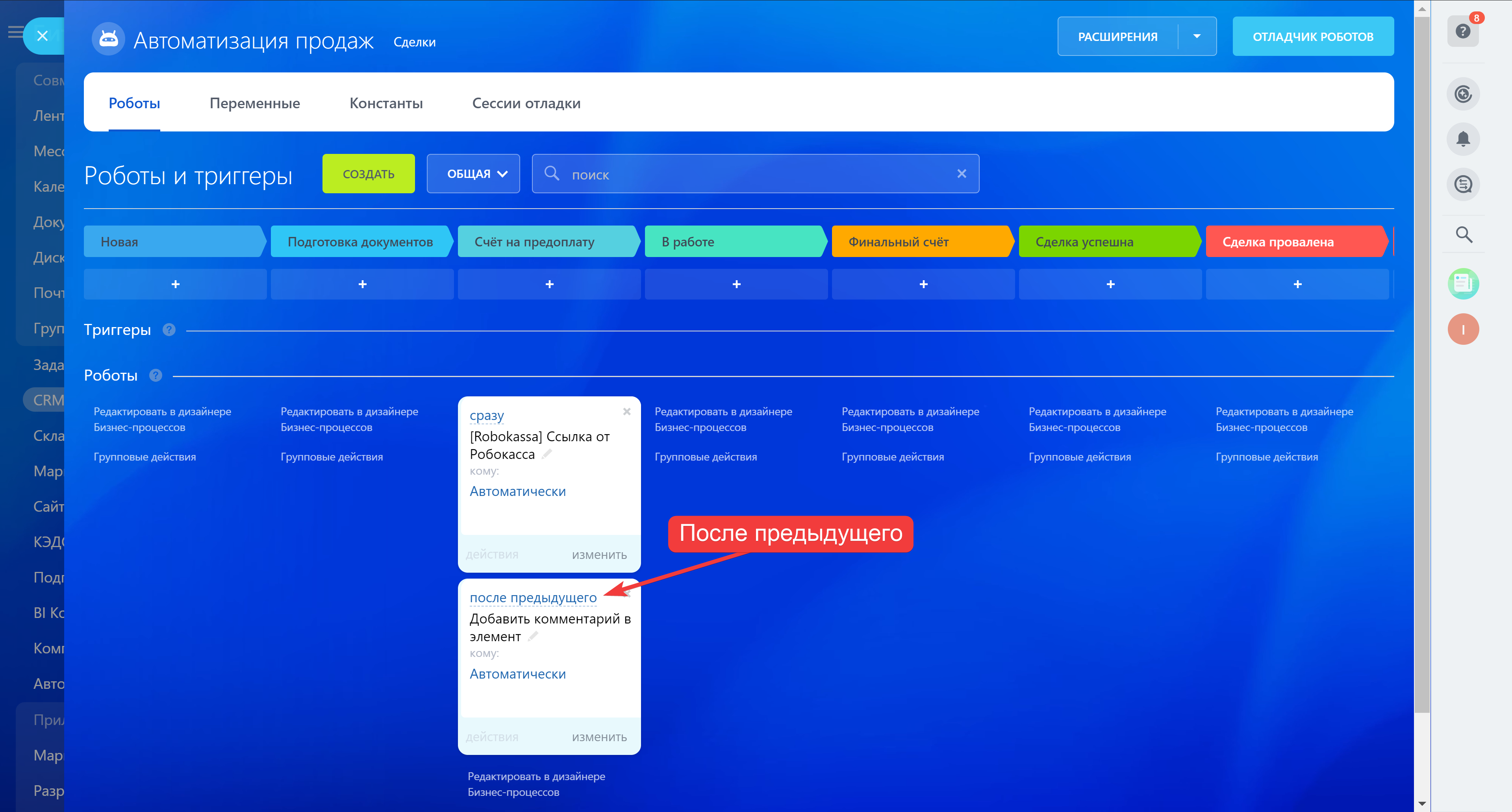 С помощью роботов можно подключить несколько юридических лиц для оплаты. Это позволяет гибко управлять платежами от разных компаний, назначать нужные стадии сделок и вести учёт с учётом юридических лиц, что особенно полезно для тех, кто ведёт бизнес через несколько компаний или филиалов.