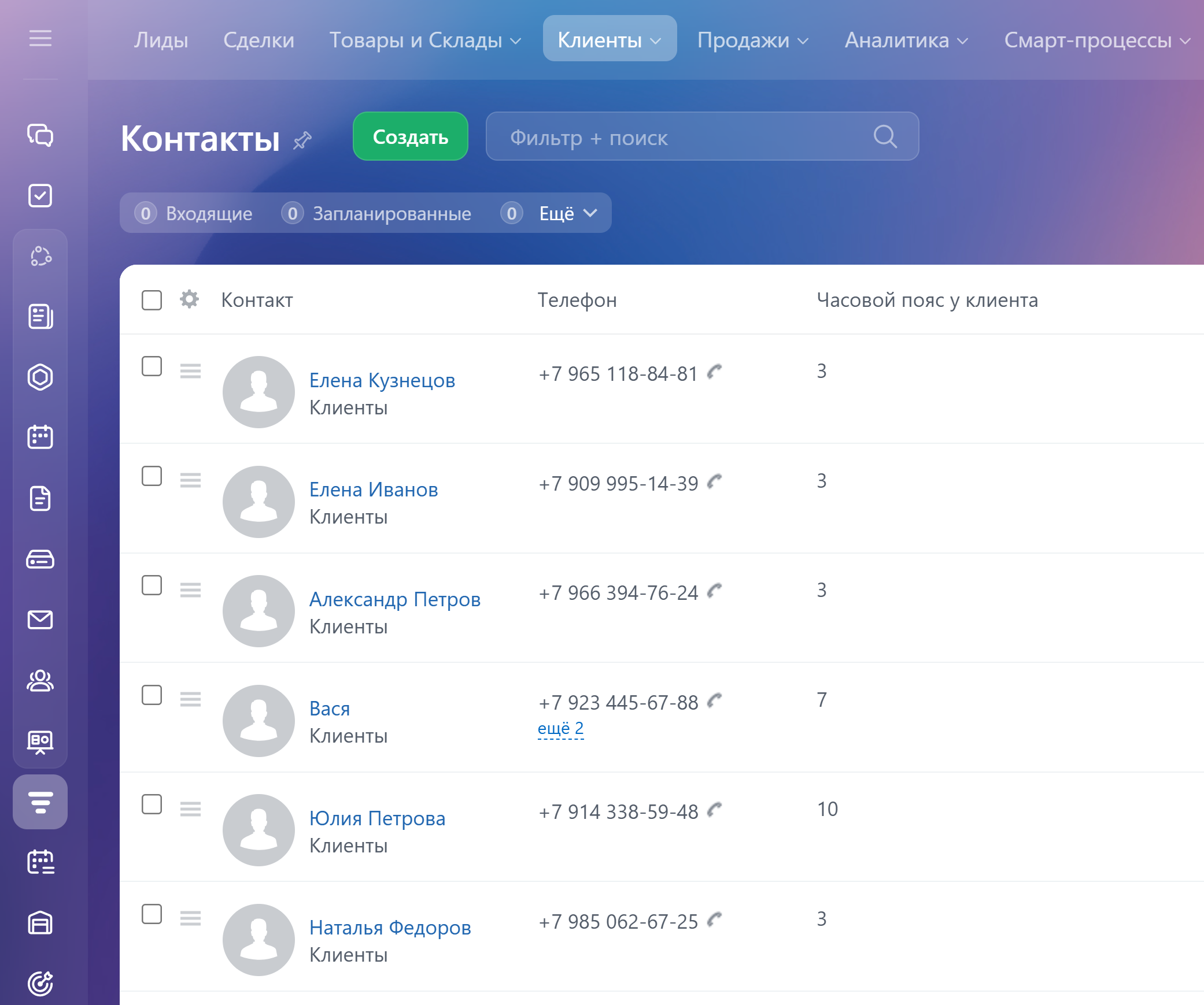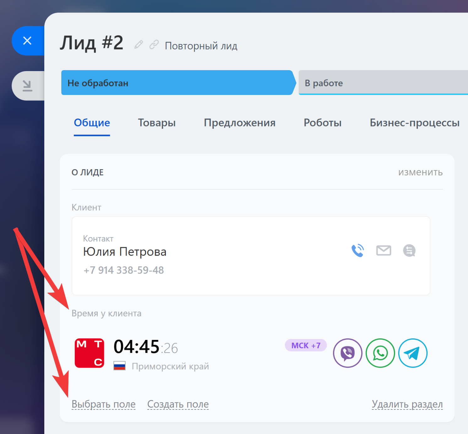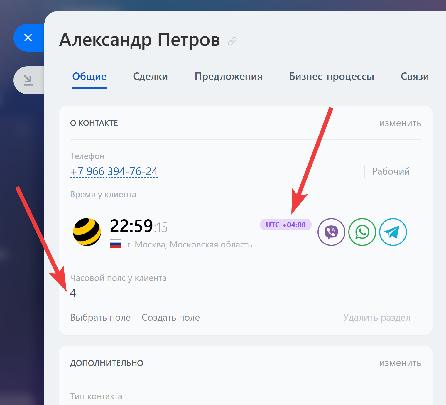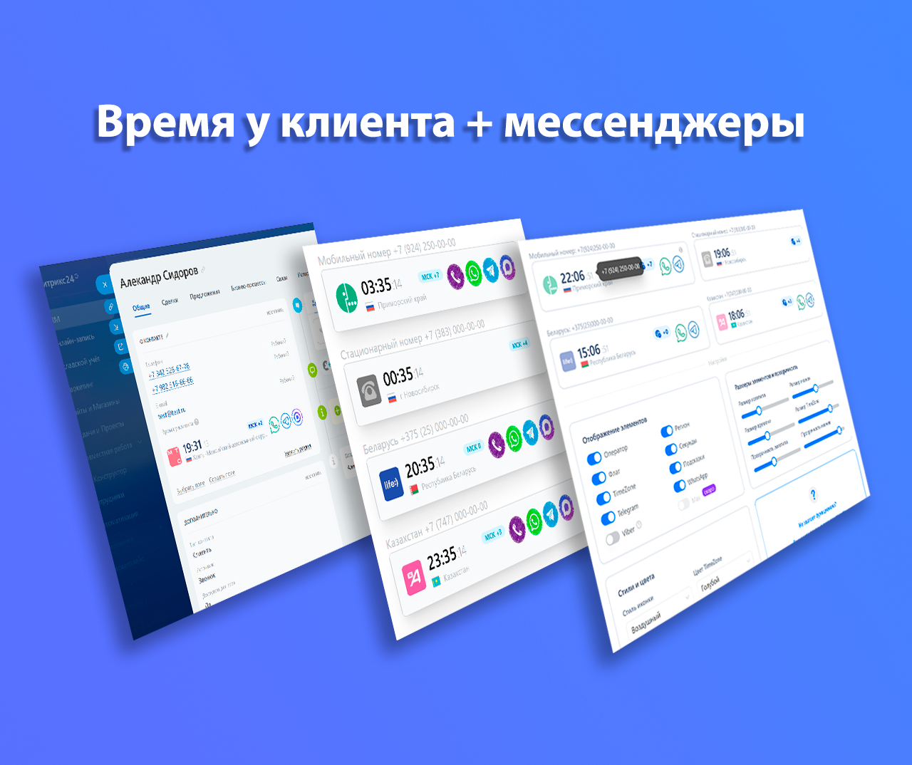 - Отображение времени клиента в Лидах, Контактах, Компаниях, Сделках и карточке звонка