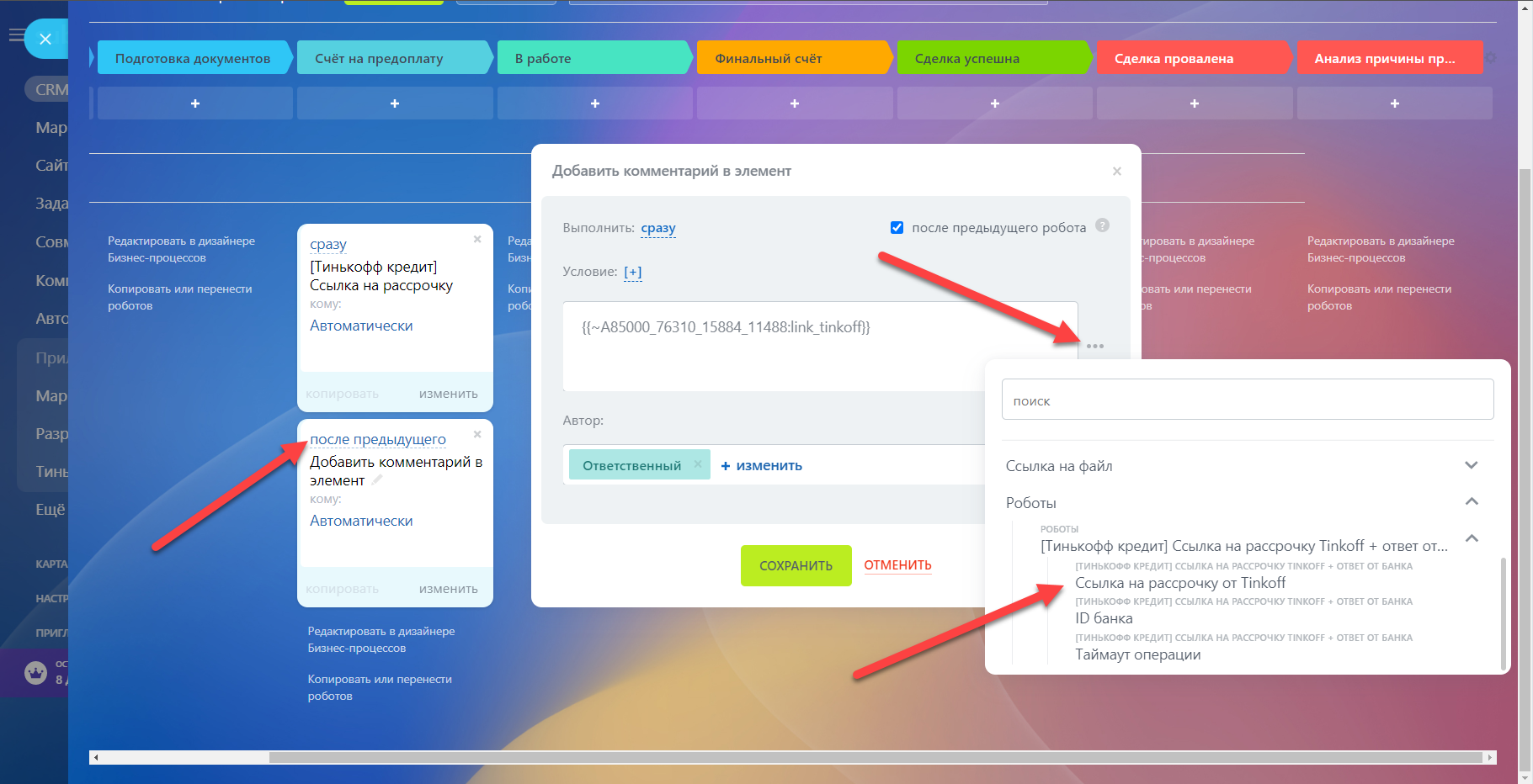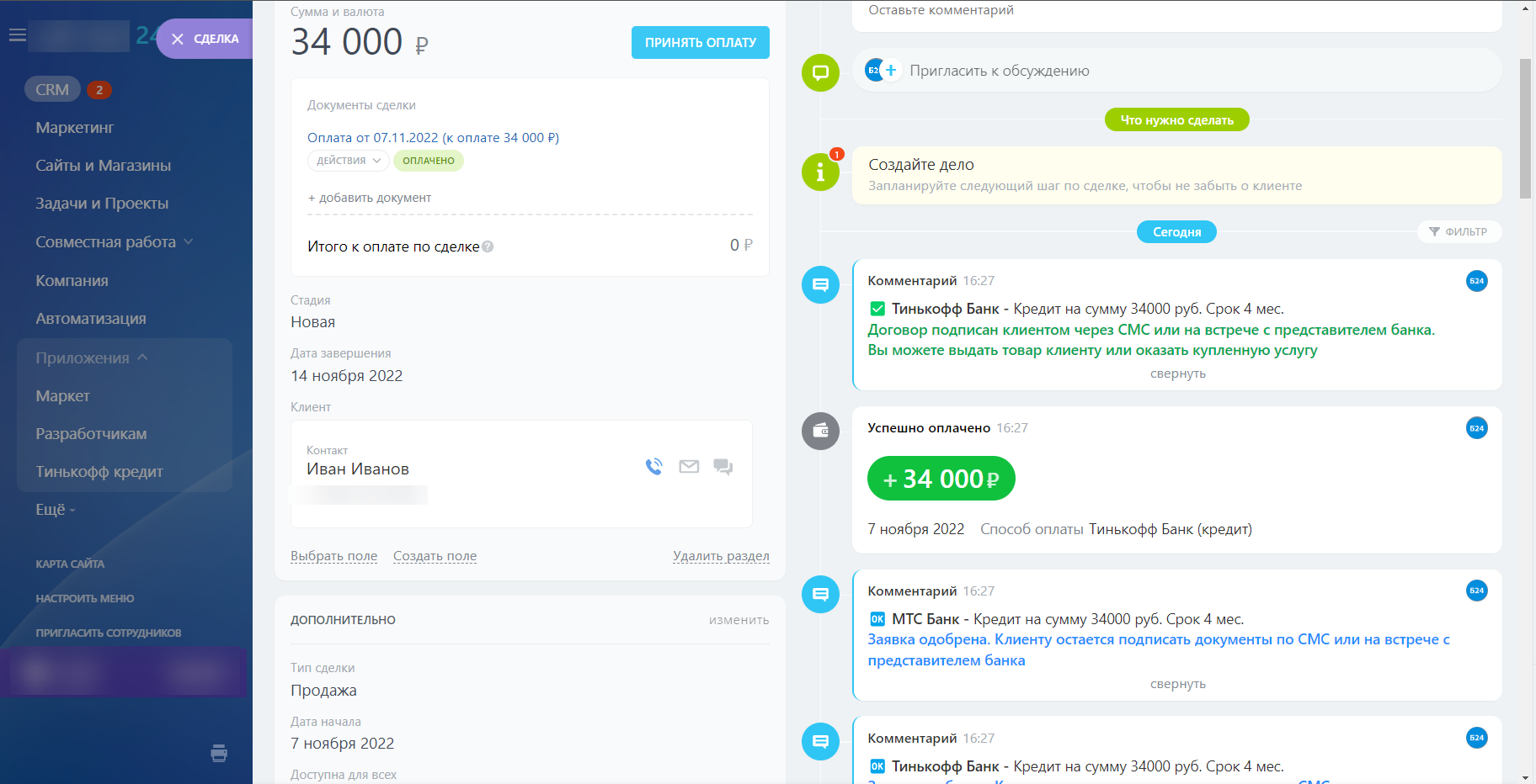 [Тинькофф кредит] Ссылка на рассрочку Tinkoff + ответ от банка - создает ссылку на анкету онлайн кредита/рассрочки. После подписания договора кредитования клиентом, меняет статус заказа на "Оплачен". Все ответы банка приходят в комментарии сделки.