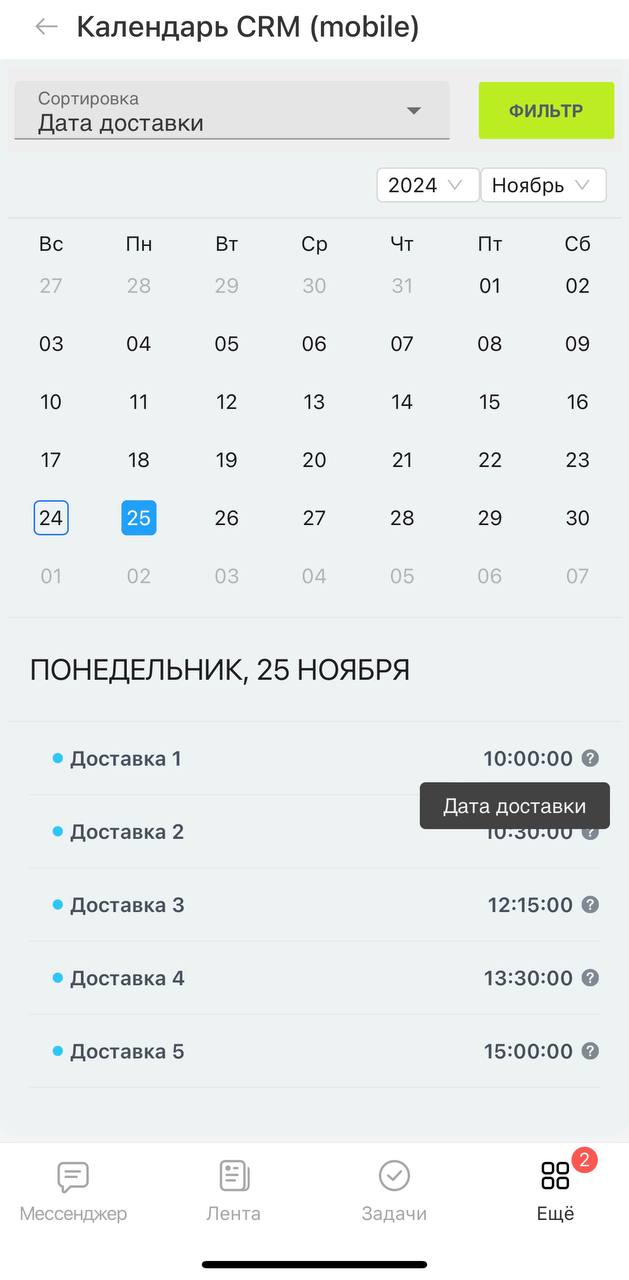 Основная цель приложения — упрощение и ускорение взаимодействия с CRM в мобильном формате, позволяя быстро находить нужное время для доставки, самовывоза, избегая пропуска важных событий.