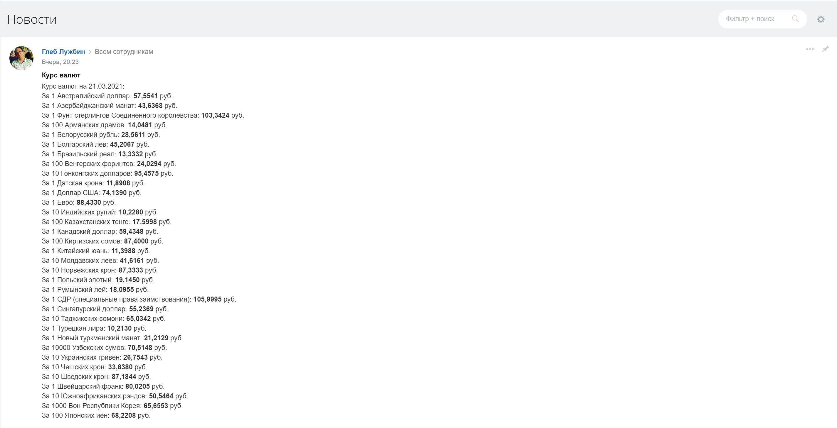 Публикация курсов валют в живой ленте компании