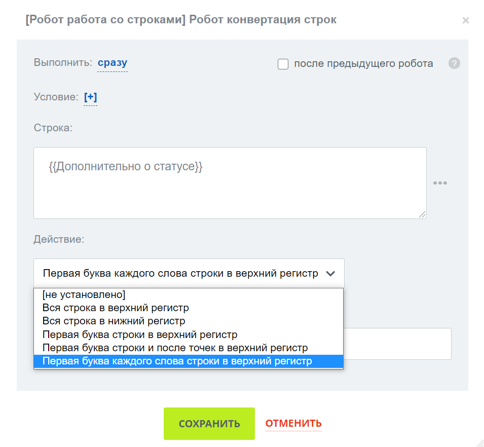 Робот преобразует текст в полях разного типа: позволяет сделать заглавной первую букву в тексте или первую букву во всех словах, преобразовать весь текст в заглавные или строчные буквы, проставить заглавные буквы после точек.