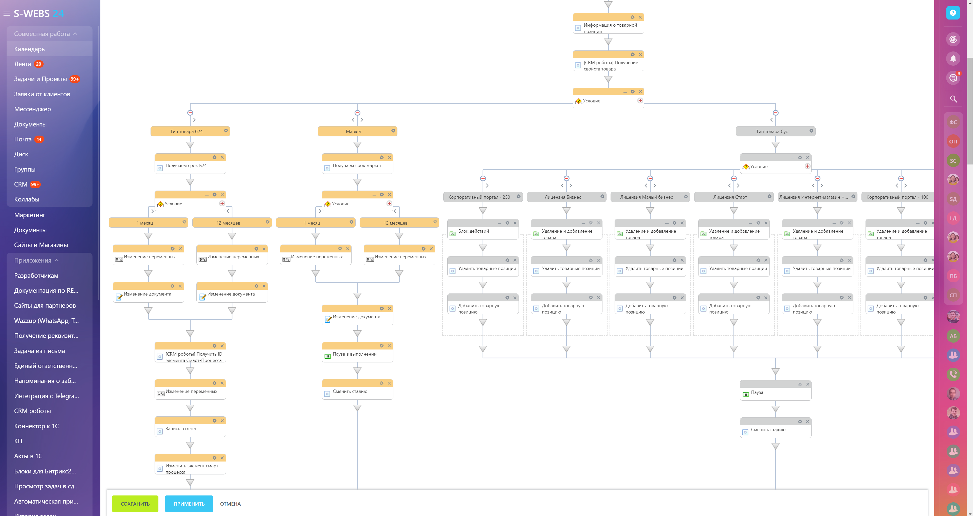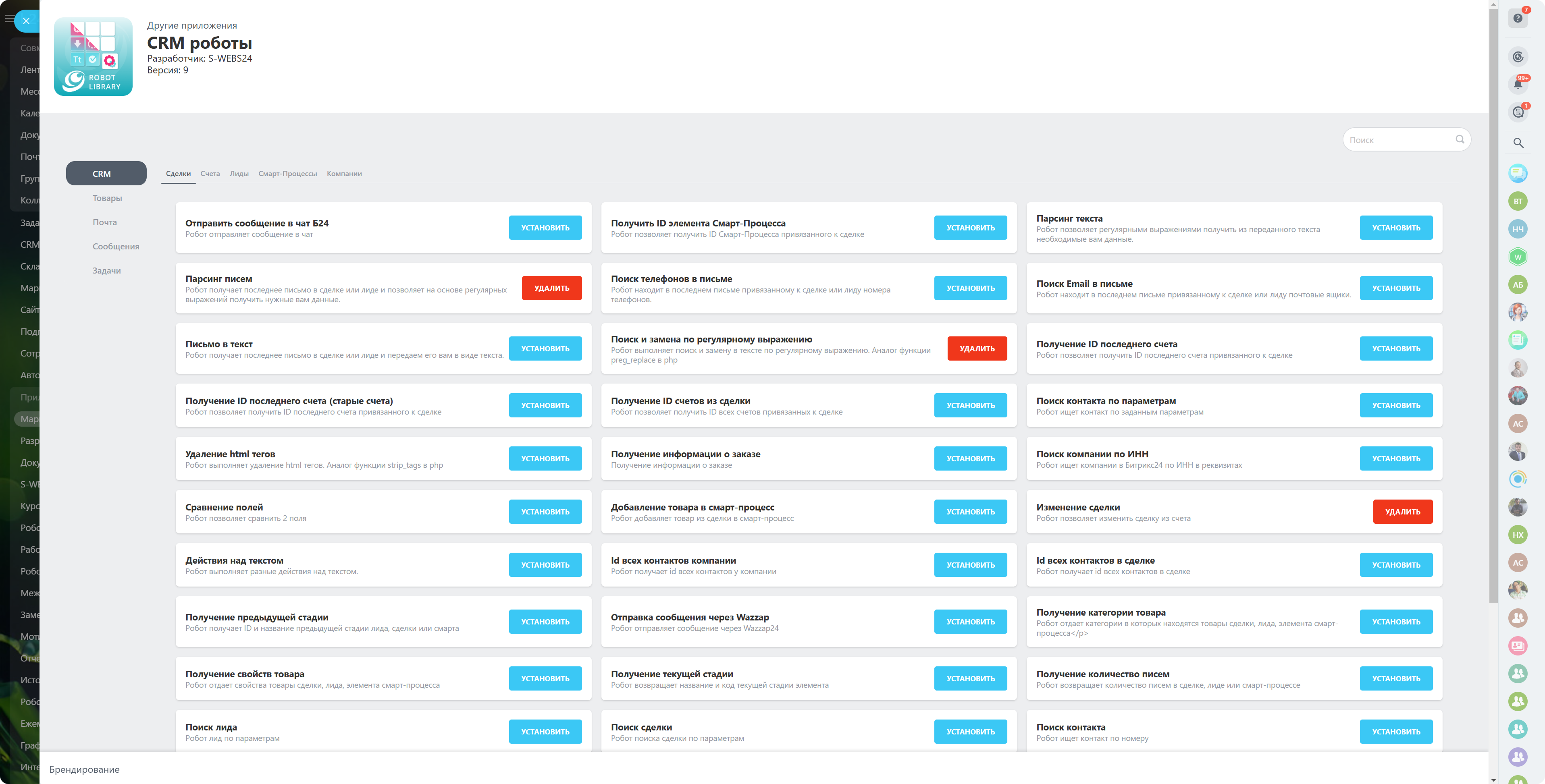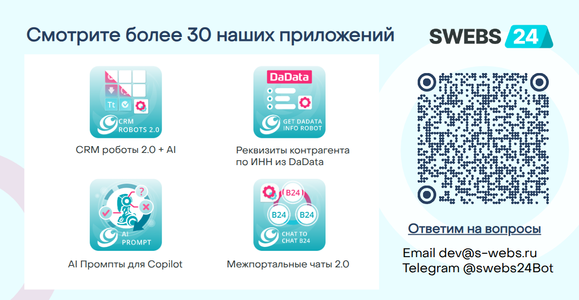 Приложение «CRM роботы» от S-WEBS - это 78 роботов и активити для бизнес-процессов Битрикс24, которые позволяют расширить стандартный функционал роботов Битрикс24 и автоматизировать многие бизнес-процессы в вашей CRM.