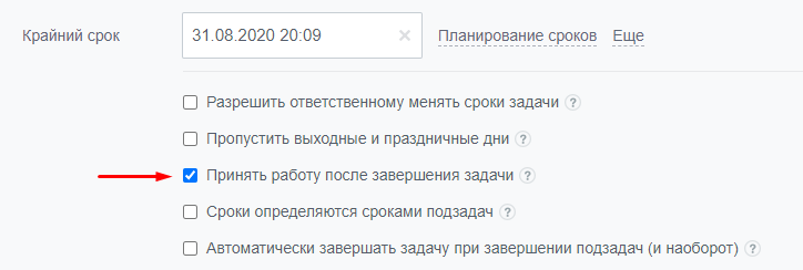 Приложение автоматические устанавливает флаг «Принять работу после завершения задачи» для всех новых задач.