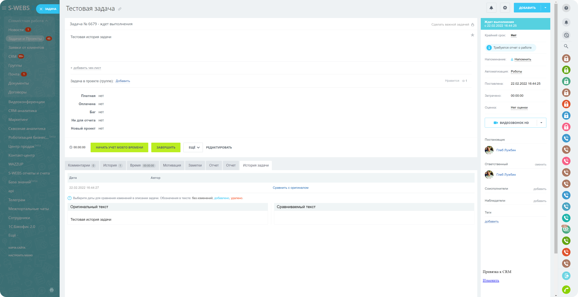 Приложение позволяет отследить изменения текстового описания задачи: увидеть дату изменения и автора, сравнить версии описания друг с другом прямо на странице задачи.