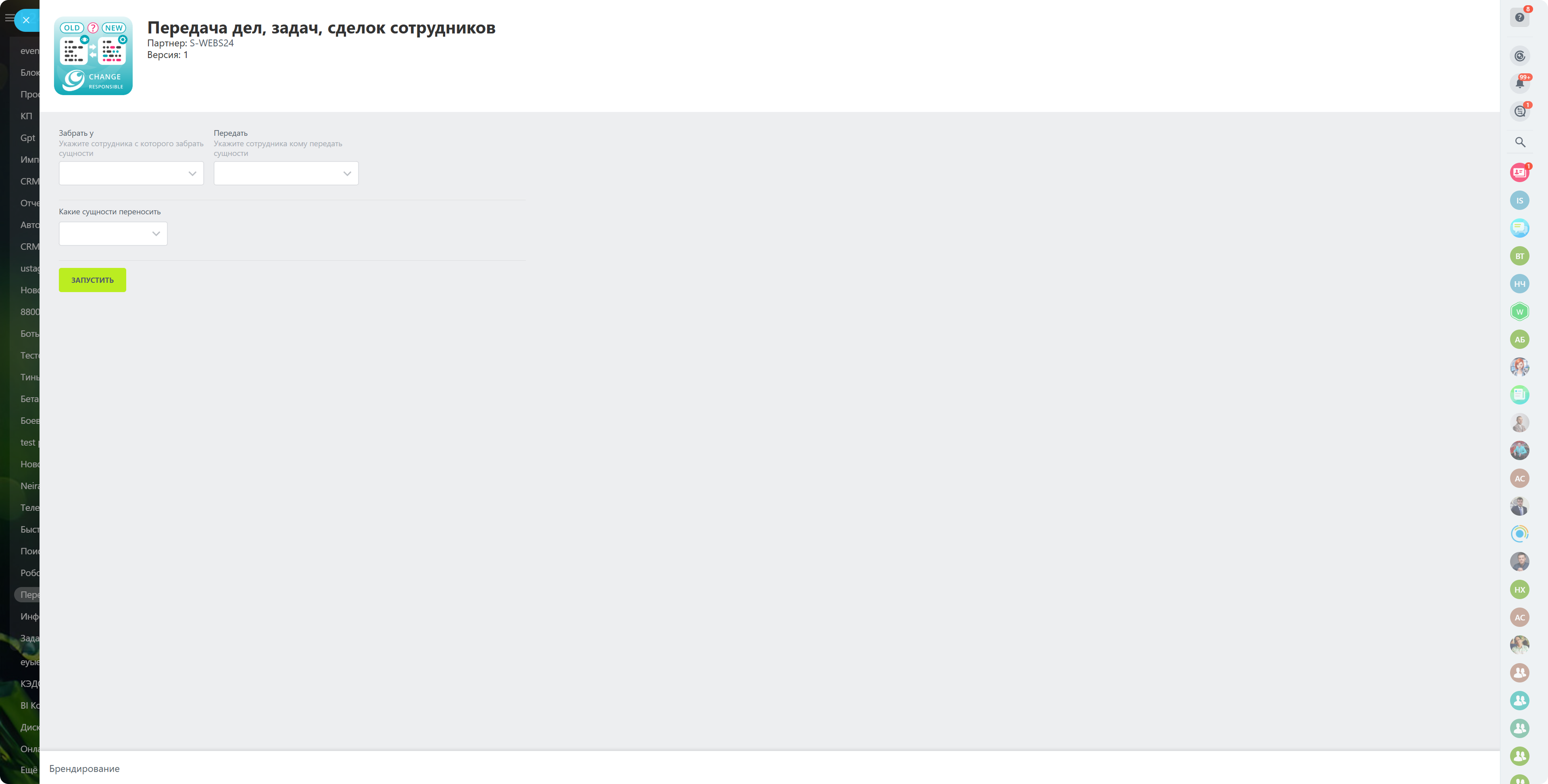 Приложение позволяет перенести сделки, счета, задачи с одного сотрудника на другого.
