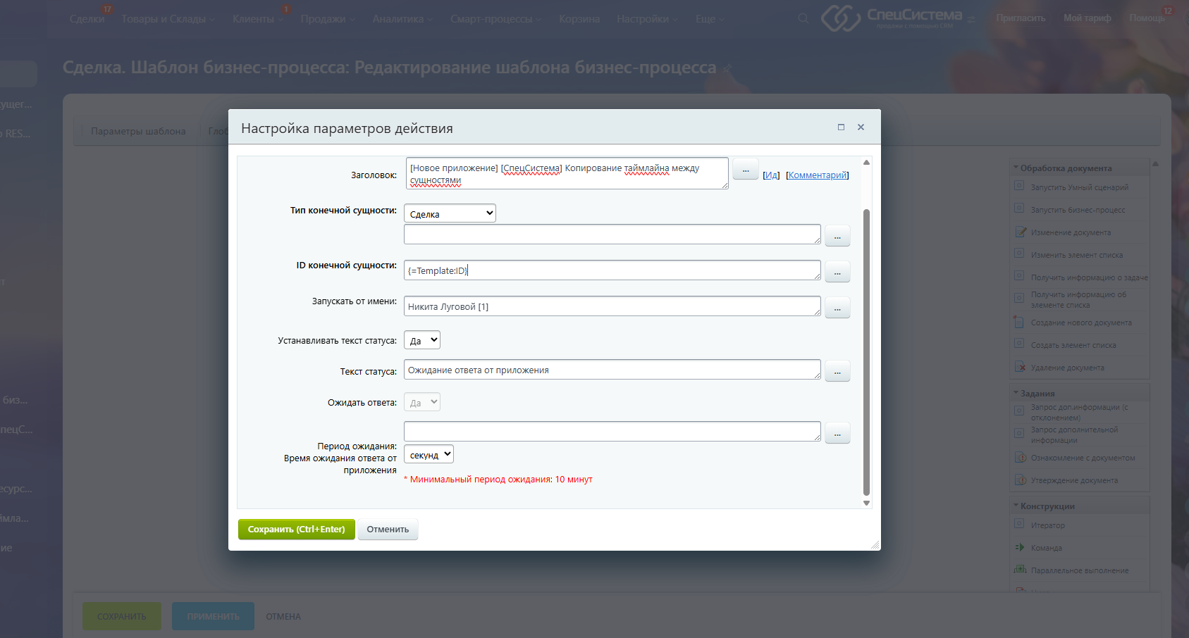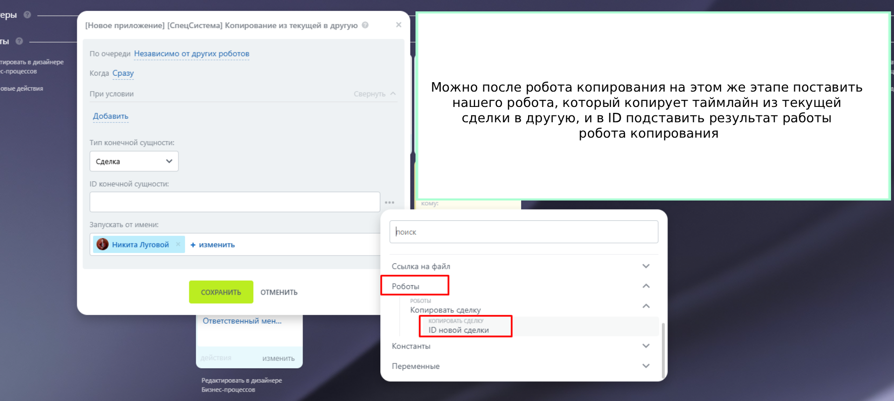 После установки приложения на портал добавляется дополнительный робот и активити в бизнес-процессах, позволяющие очень просто переносить таймлайн между сущностями.