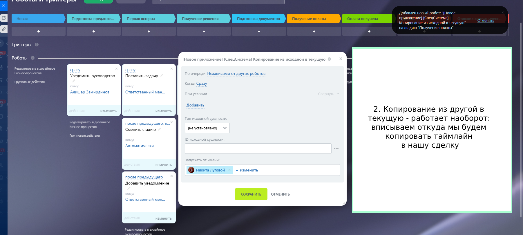 Данное приложение актуально в ситуациях, когда сделка копируется в другую воронку и необходимо сохранить всю историю взаимодействия с клиентом в новой сделке