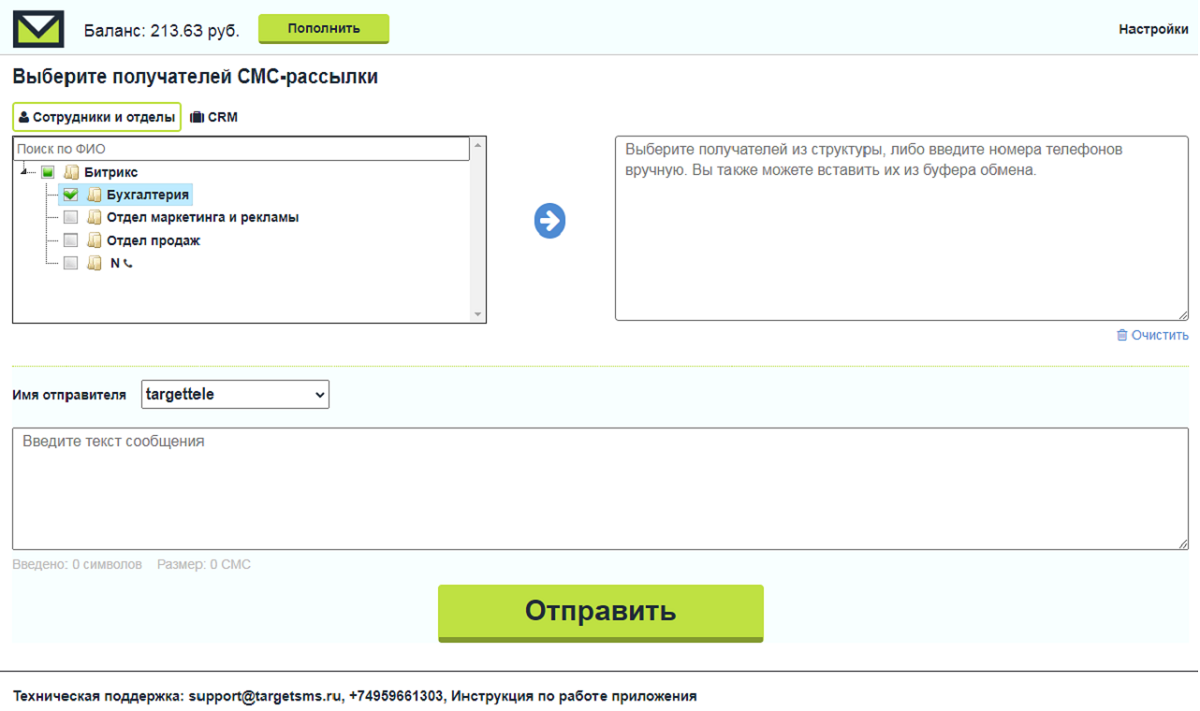 - Отправка сообщений контактам, загруженным из структуры данных Вашего аккаунта bitrix24.ru (клиенты, сотрудники, поставщики и т.п.);