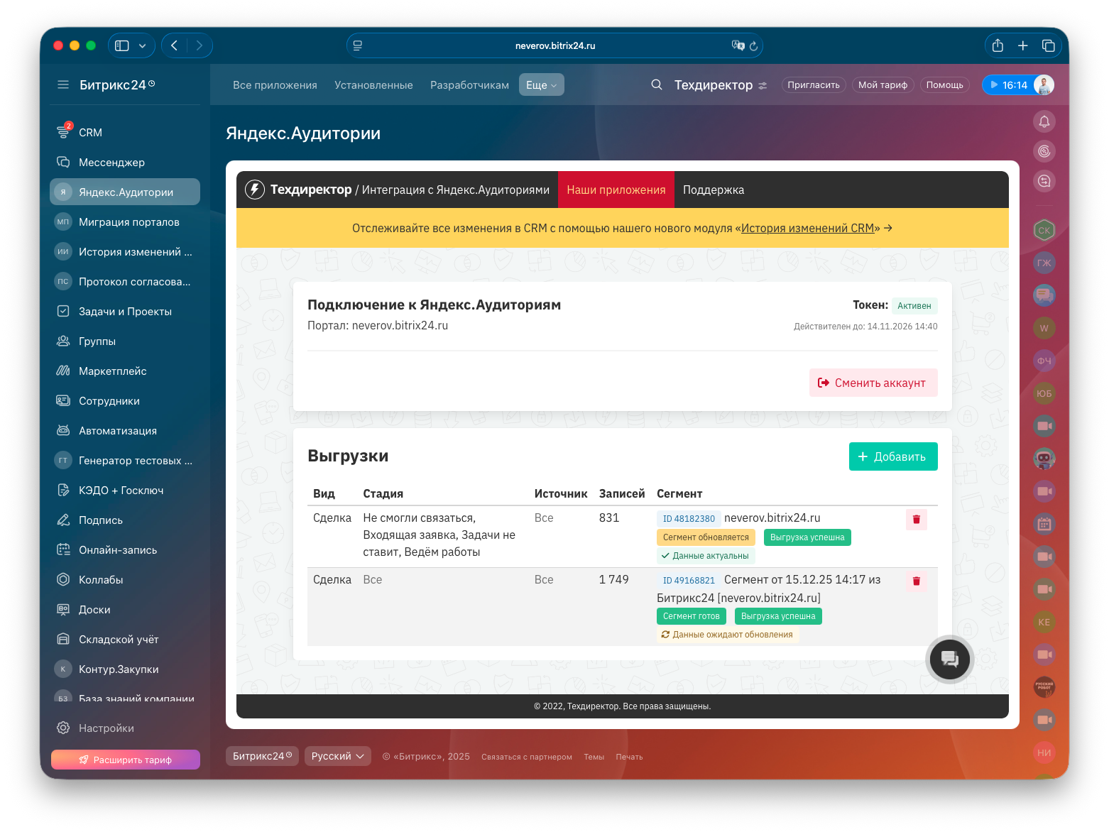 Таким образом, сегменты в Яндекс.Аудиториях всегда актуальны и полностью соответствуют текущему состоянию CRM.