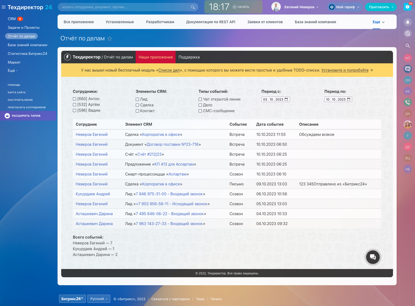 Модуль собирает информацию по всем запланированным сотрудниками делам в CRM и выводит в виде отчёта с удобными возможностями по фильтрации.