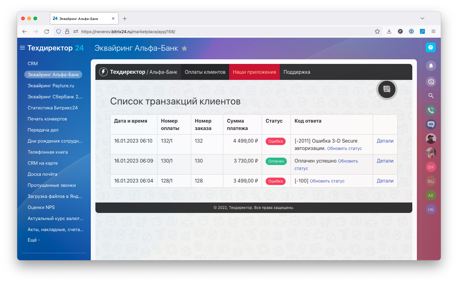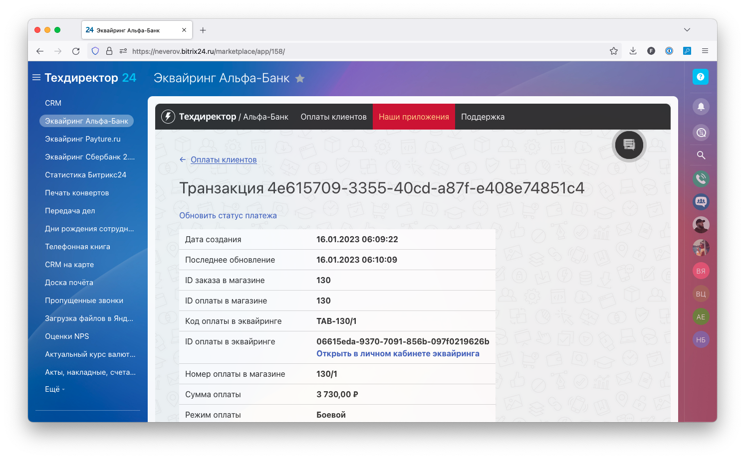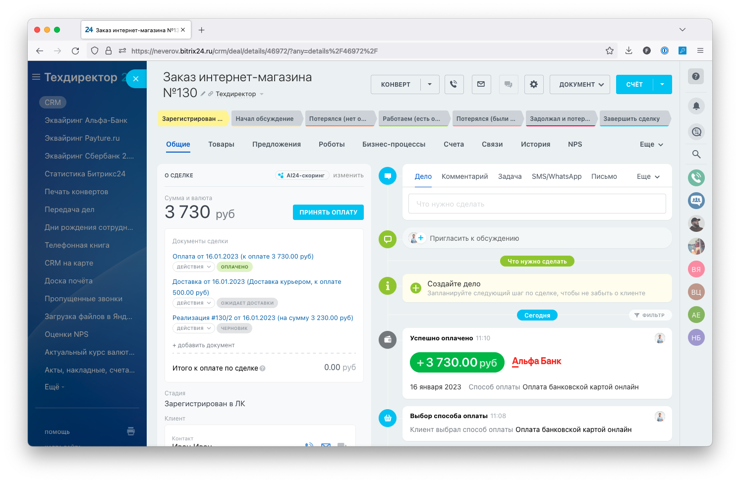 - Автоматическое изменение статуса заказа/сделки в зависимости от статуса проведения платежа.
