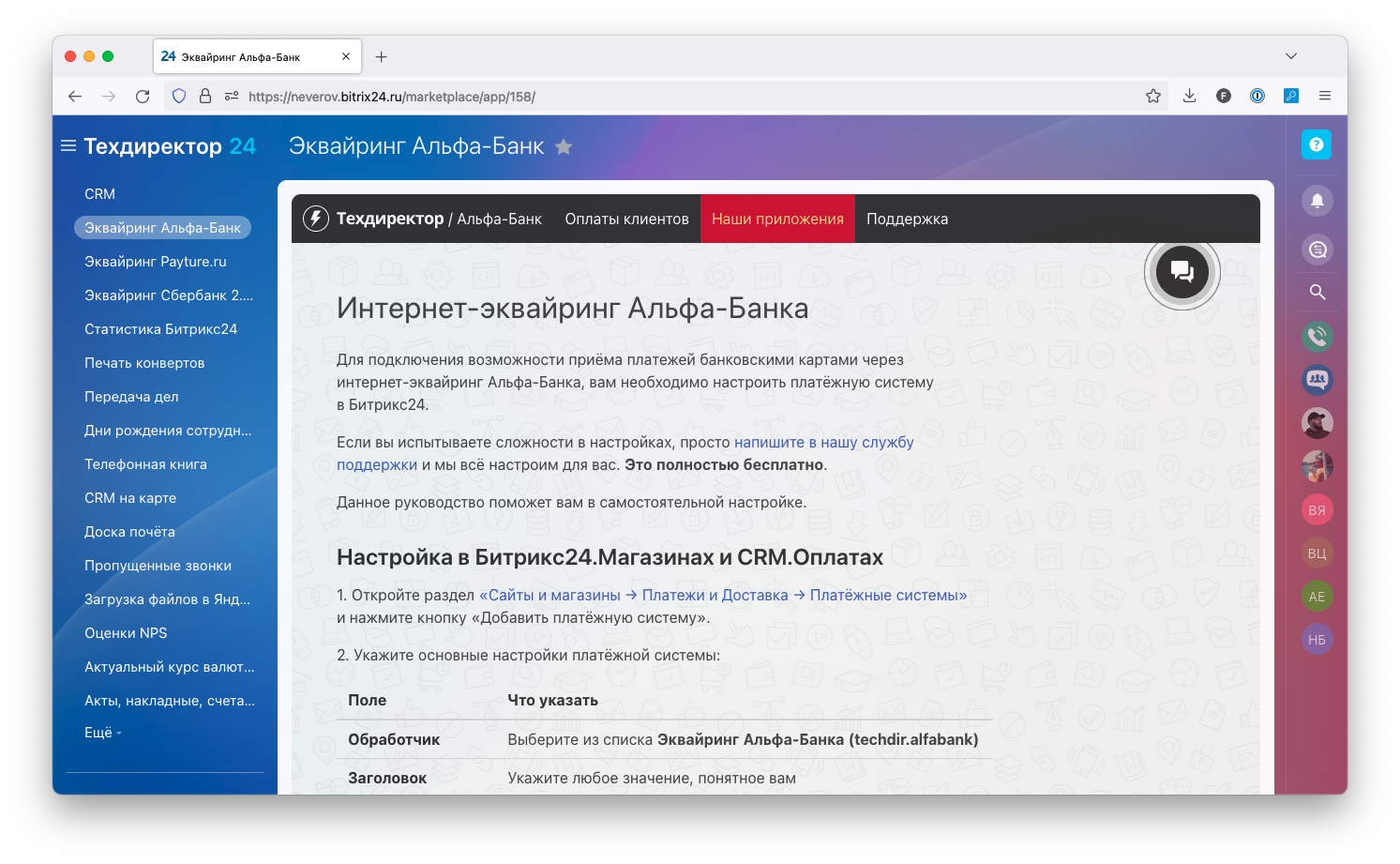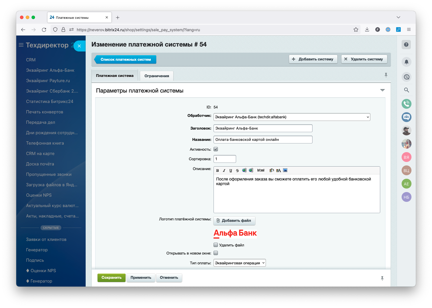 Приложение позволяет в автоматическом режиме принимать оплату заказов в интернет-магазинах Битрикс24 и счетах CRM банковскими картами Visa, MasterCard, UnionPay, JCB, Мир через систему быстрых платежей (СБП) и Яндекс.Pay.