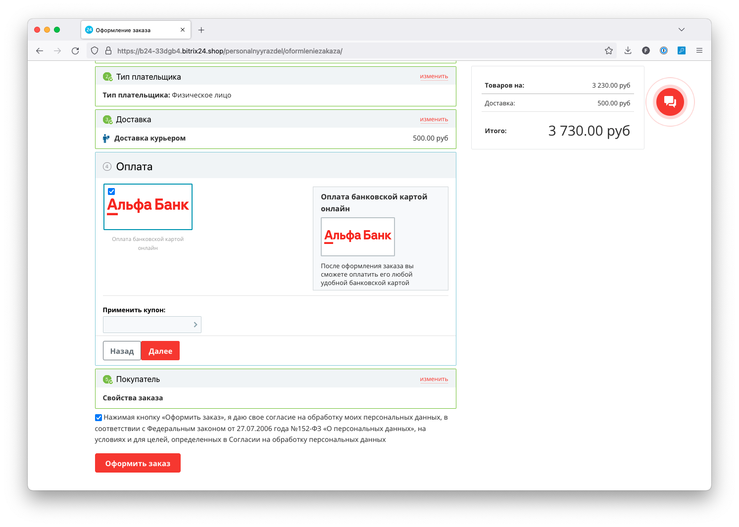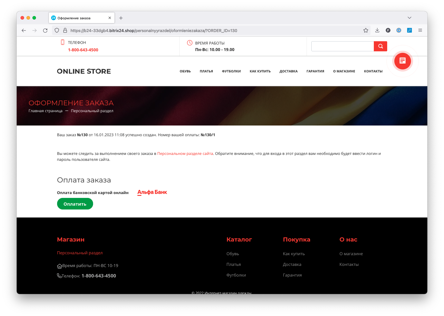 Если у вас разработан интернет-магазин на платформе Битрикс24.Магазины, онлайн-оплата будет автоматически доступна при оформлении заказа в магазине. Состав заказа автоматически попадёт в онлайн-чек. После оплаты в информации о заказе появится знак оплаты.