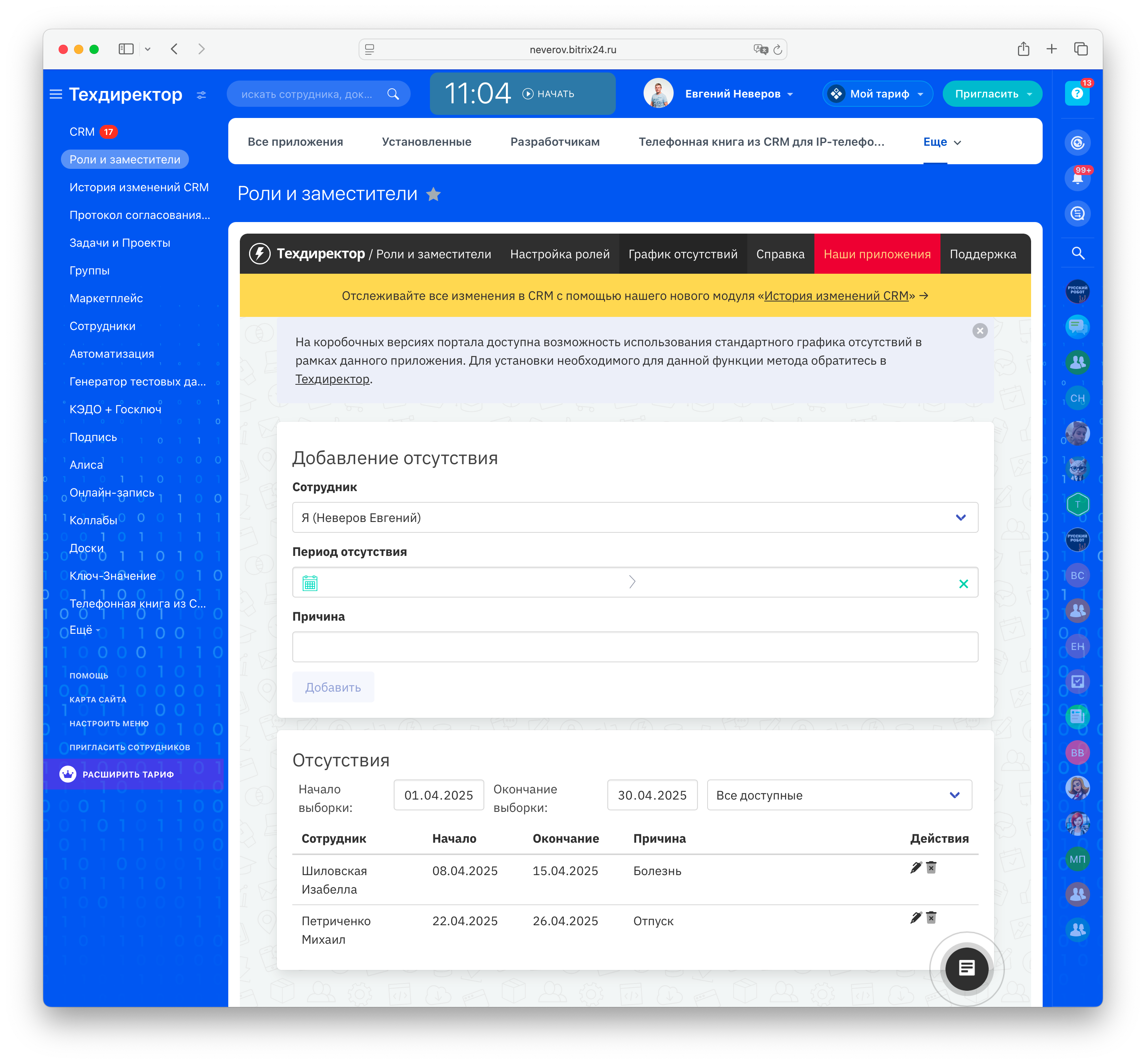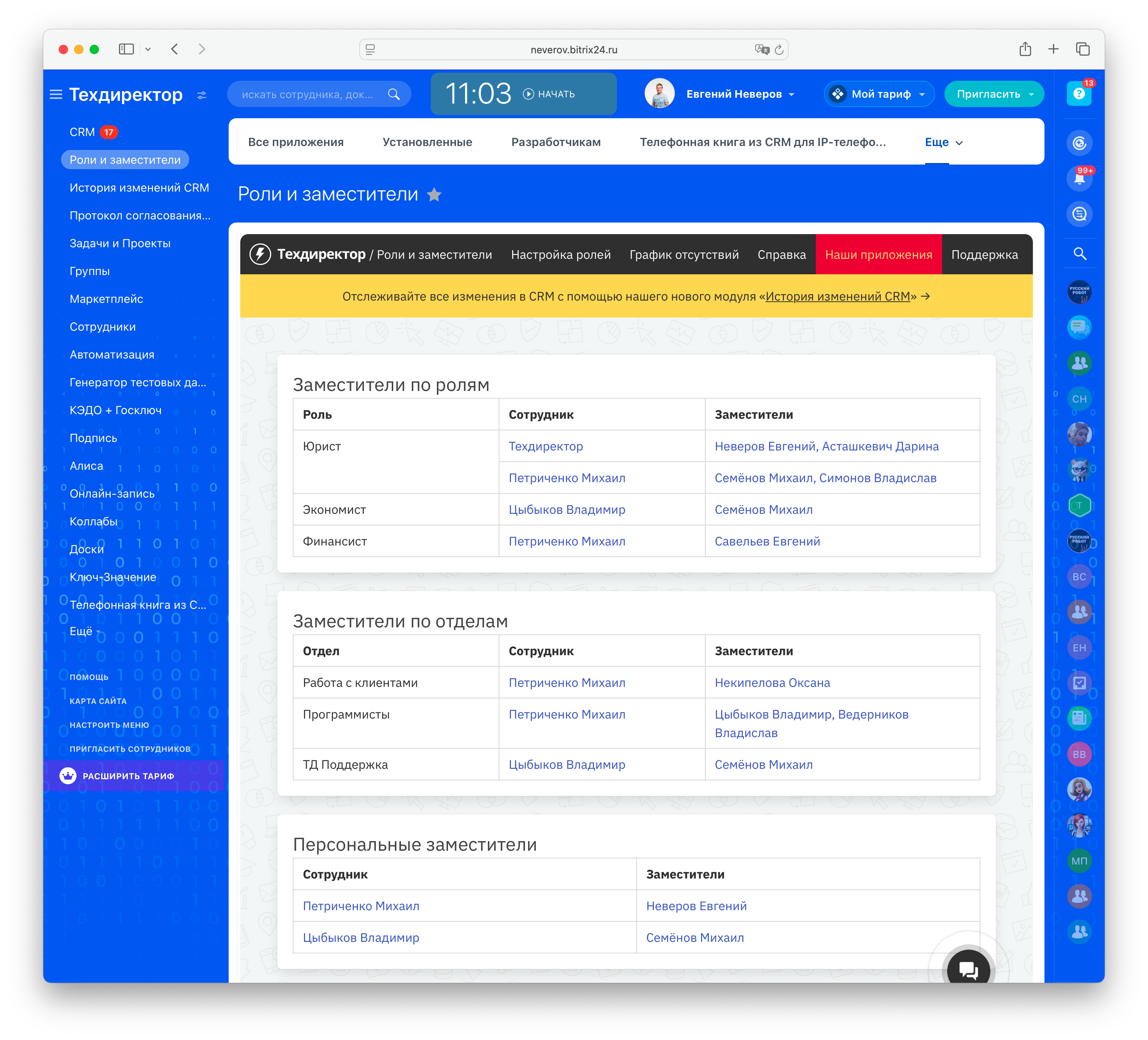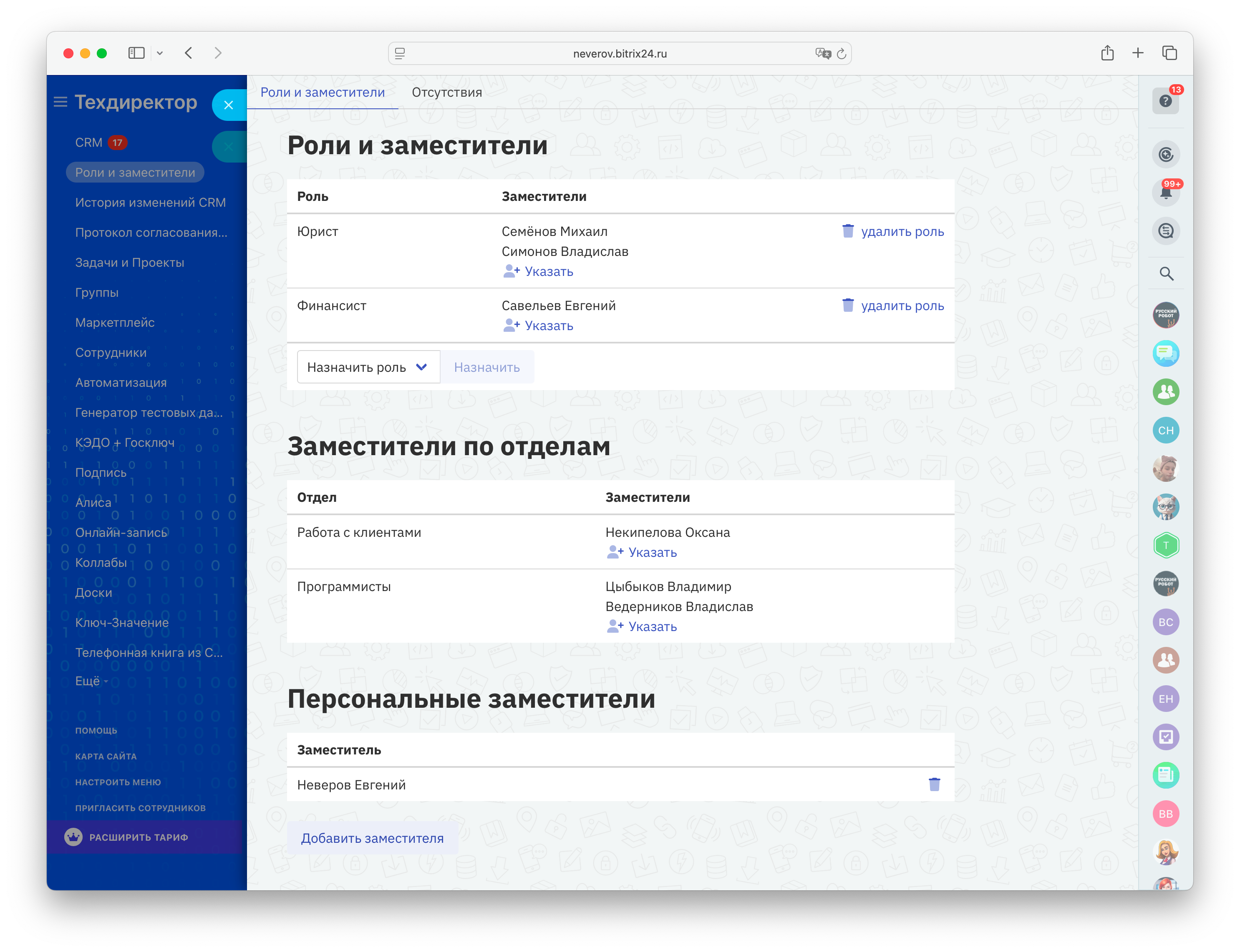 Модуль позволяет назначить каждому сотруднику портала Битрикс24 заместителей трёх видов: