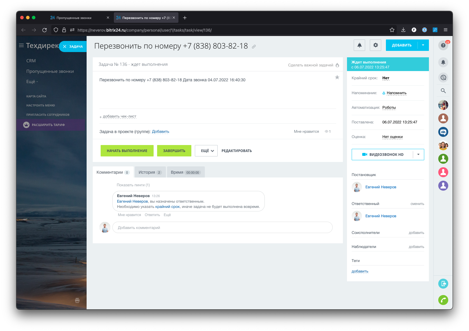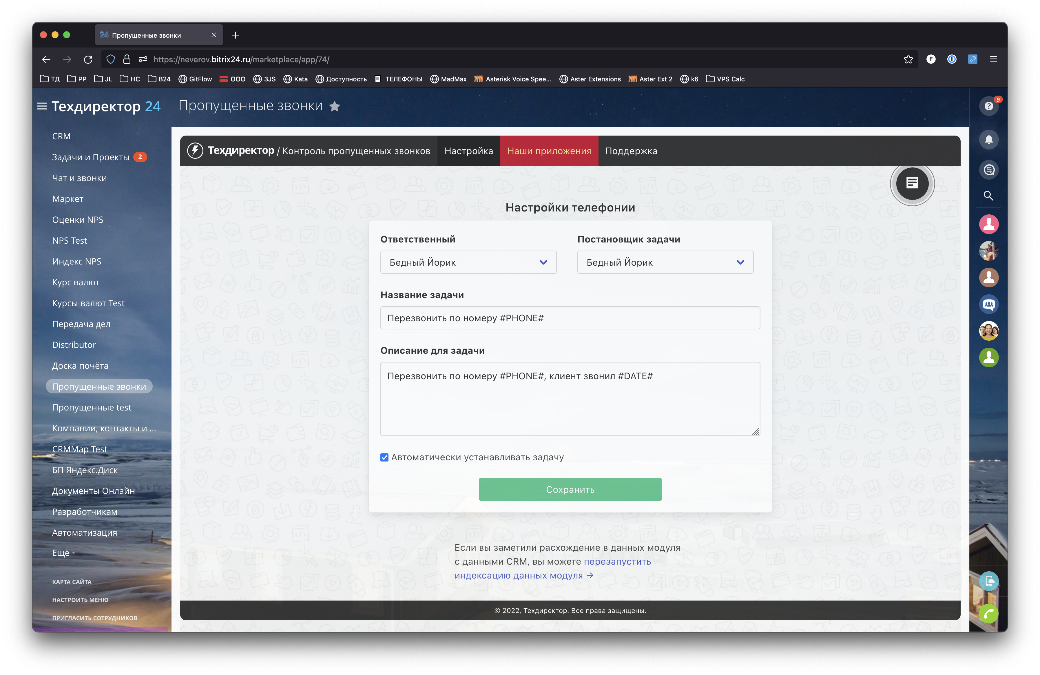 Приложение легко настраивается таким образом, чтобы при пропуске звонка автоматически ставить задачу на сотрудника с требованием перезвонить клиенту. Далее руководитель отдела сотрудника сможет проконтролировать выполнение данной задачи.