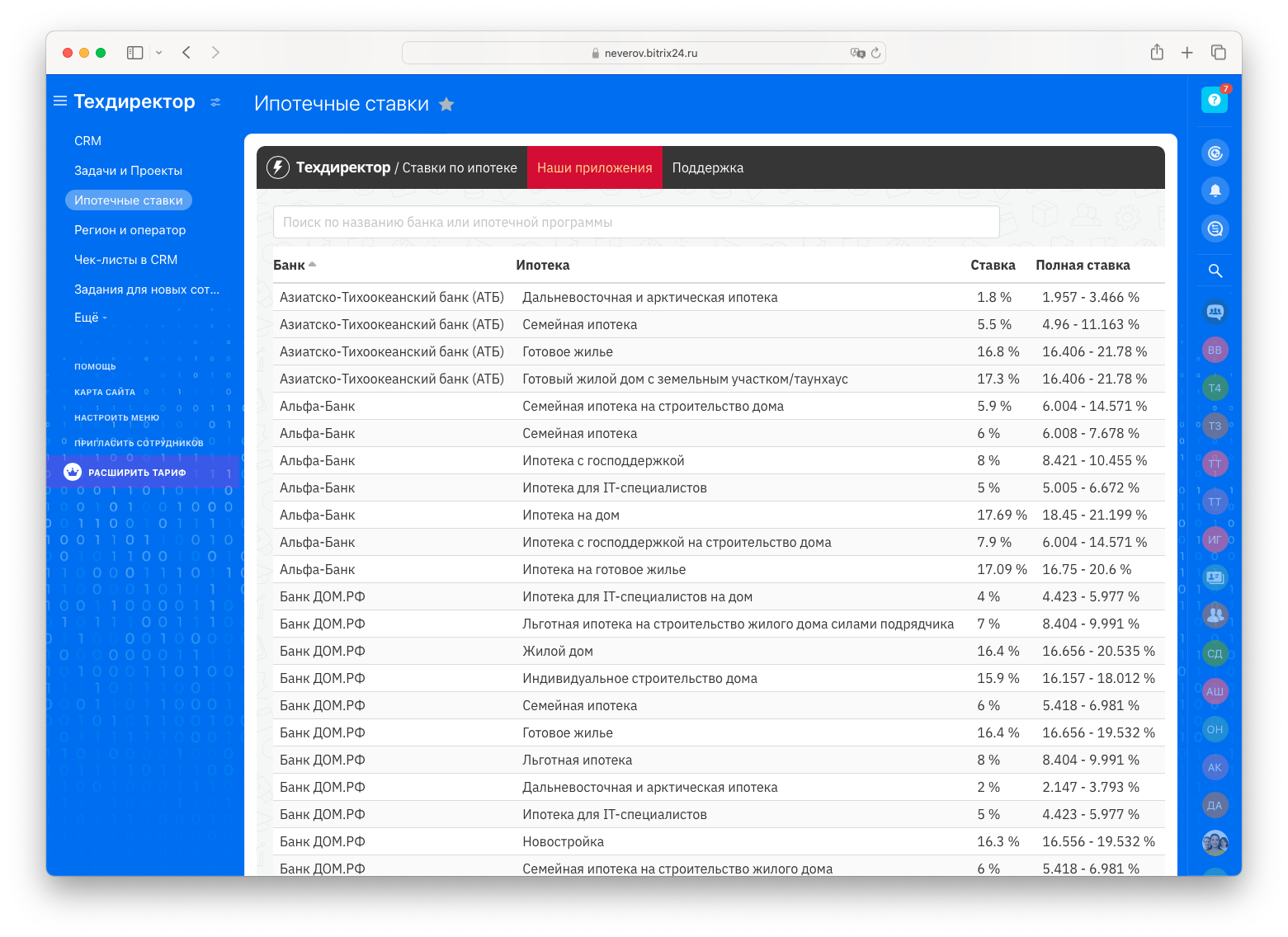 Приложение показывает актуальные ставки по ипотеке (как промо-ставки, так и полные ставки) в крупнейших банках России. Модуль доступен как в виде отдельного пункта главного меню, так и в виде кнопки в блоке баз знаний в CRM (в лидах и сделках).