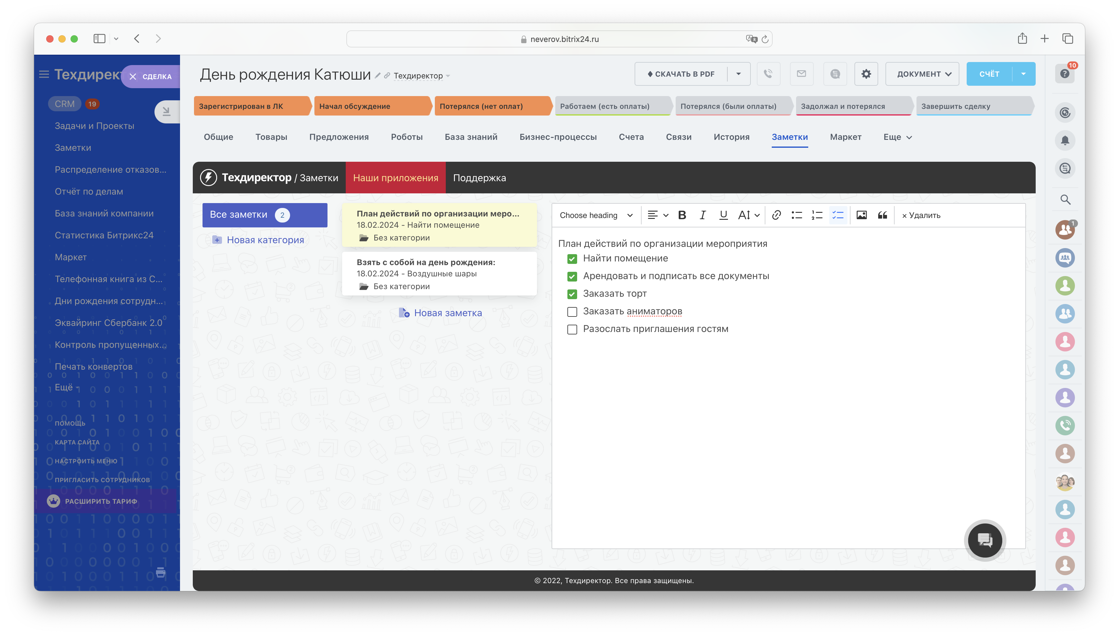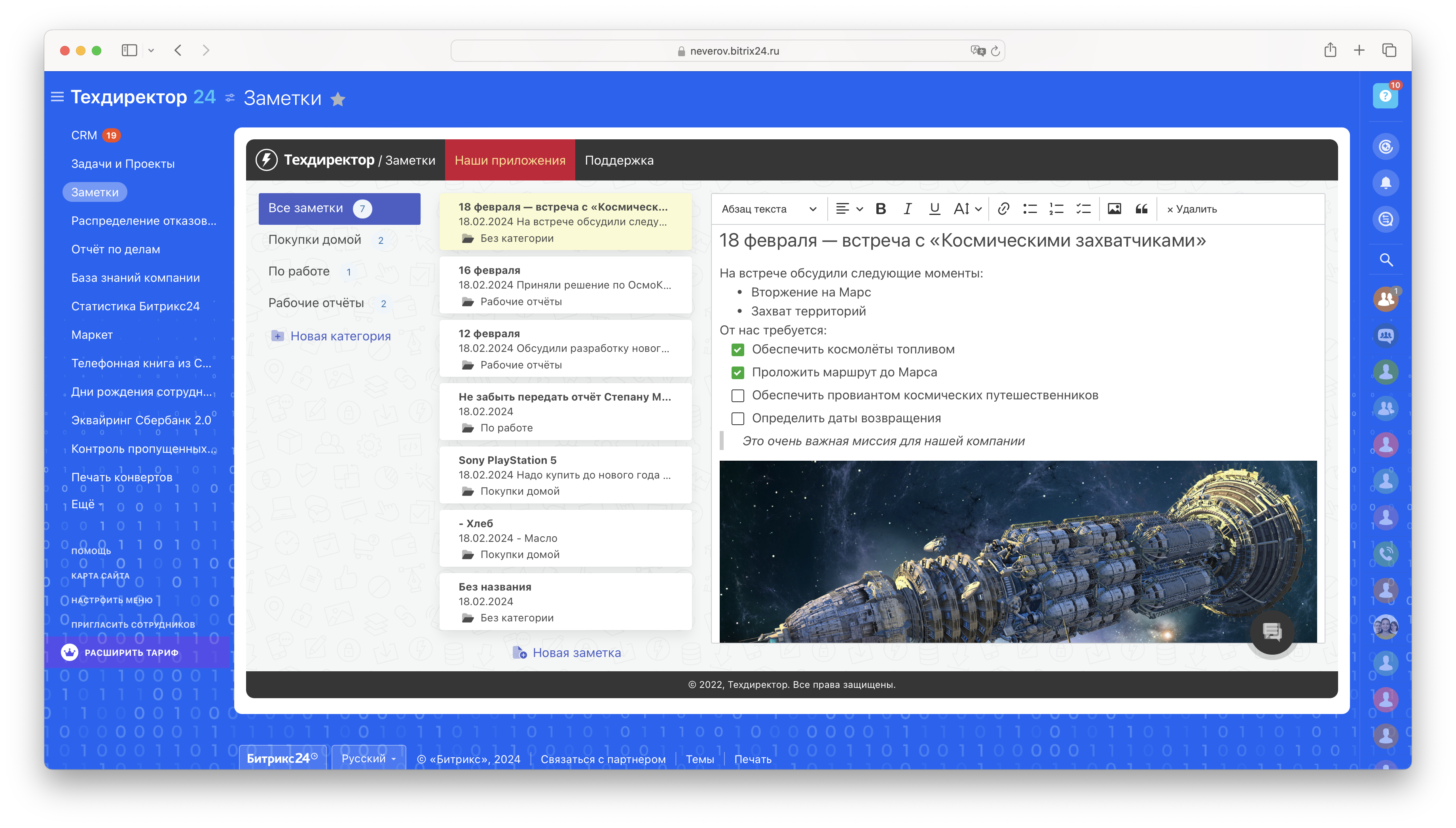 Приложение позволяет вести заметки: личные, в объектах CRM (лидах, контактах, компаниях и сделках), в объектах любых смарт-процессов, в задачах, группах и проектах