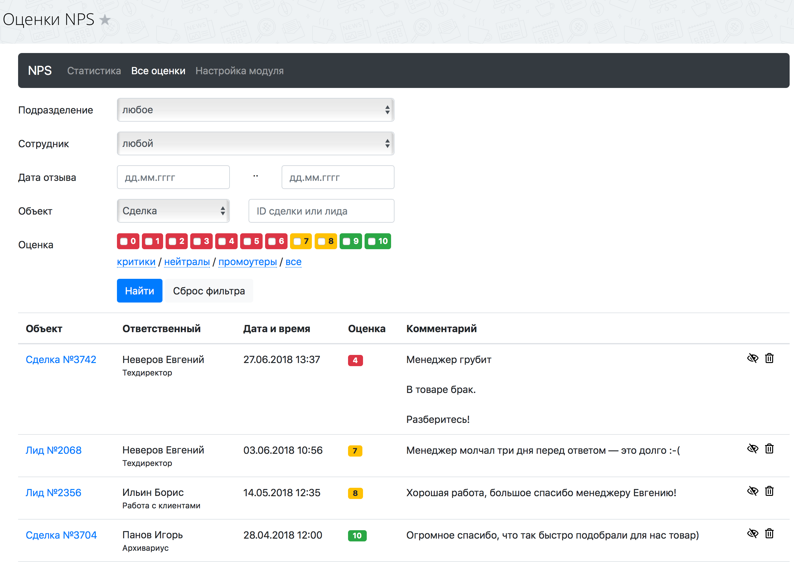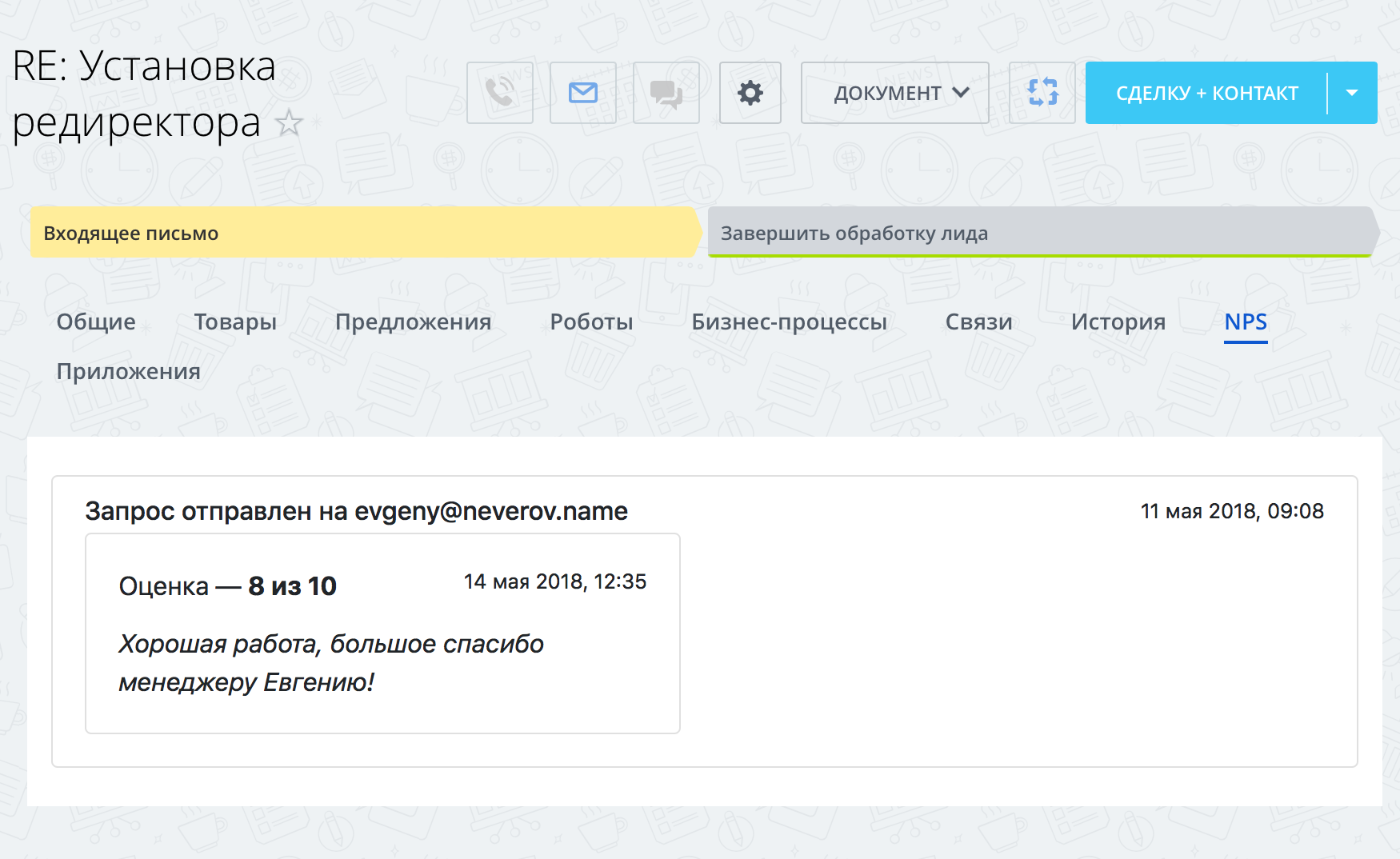 Плюс: отзывы клиента показываются прямо в CRM в карточке сделки или лида во вкладке NPS.