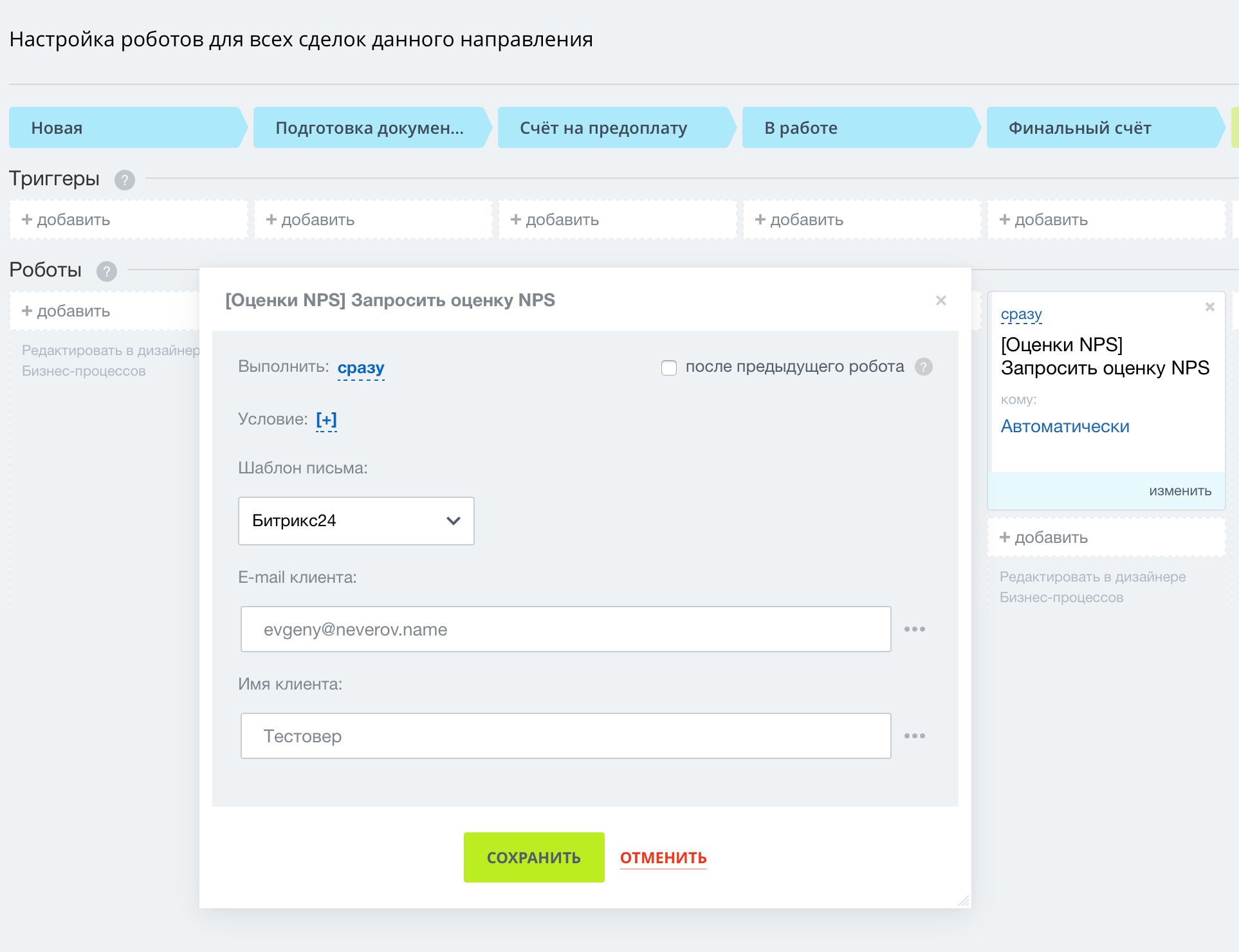 Письмо или СМС отправляется с помощью робота CRM, либо с помощью бизнес-процессов портала. Это может происходить, например, при достижении определённого статуса лидом или сделкой.
