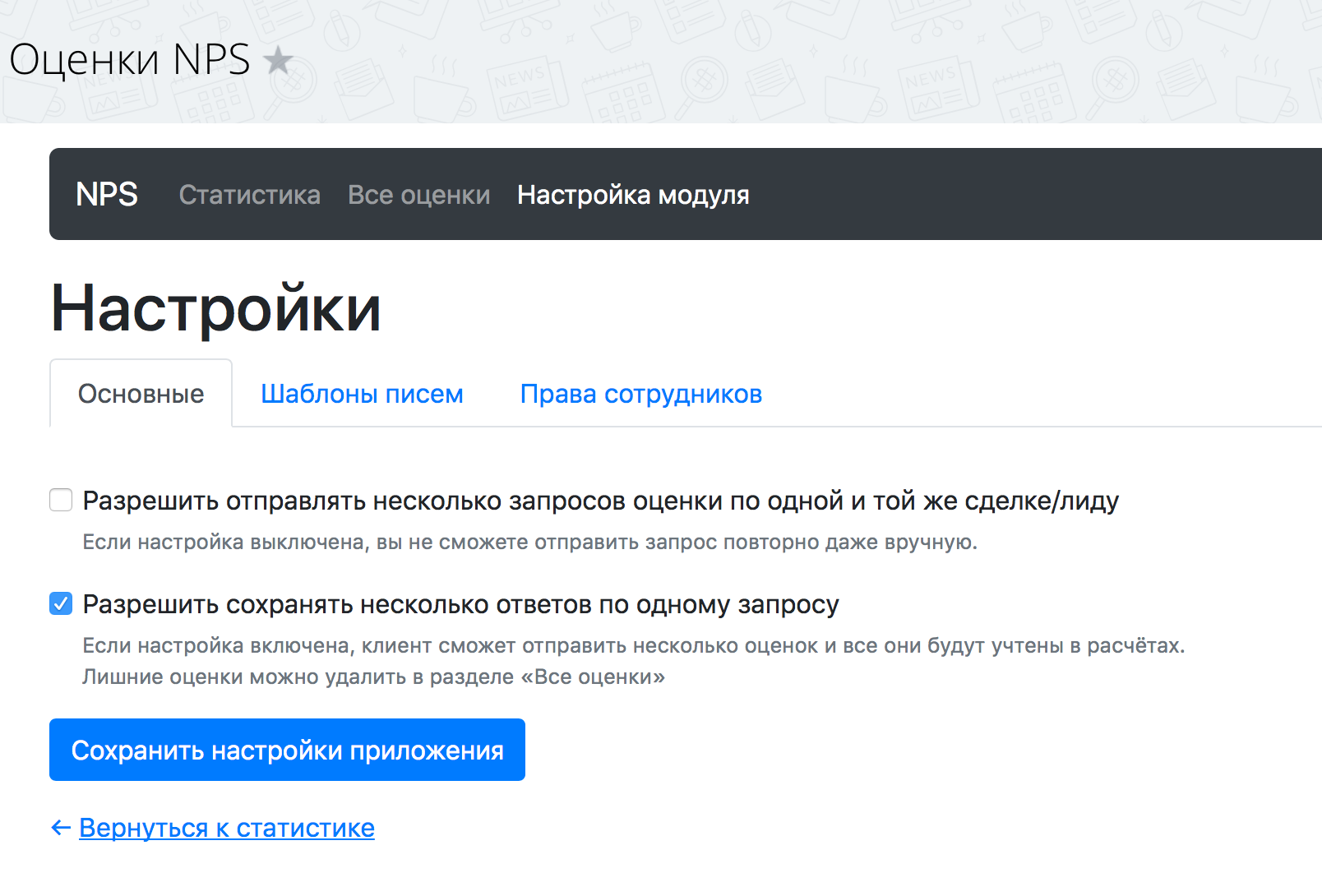 Индекс лояльности NPS (англ. Net Promoter Score) — индекс определения приверженности потребителей товару или компании (индекс готовности рекомендовать), используется для оценки готовности к повторным покупкам. Модуль позволяет организовать процесс автоматизированного сбора оценок с клиентов в вашей CRM.