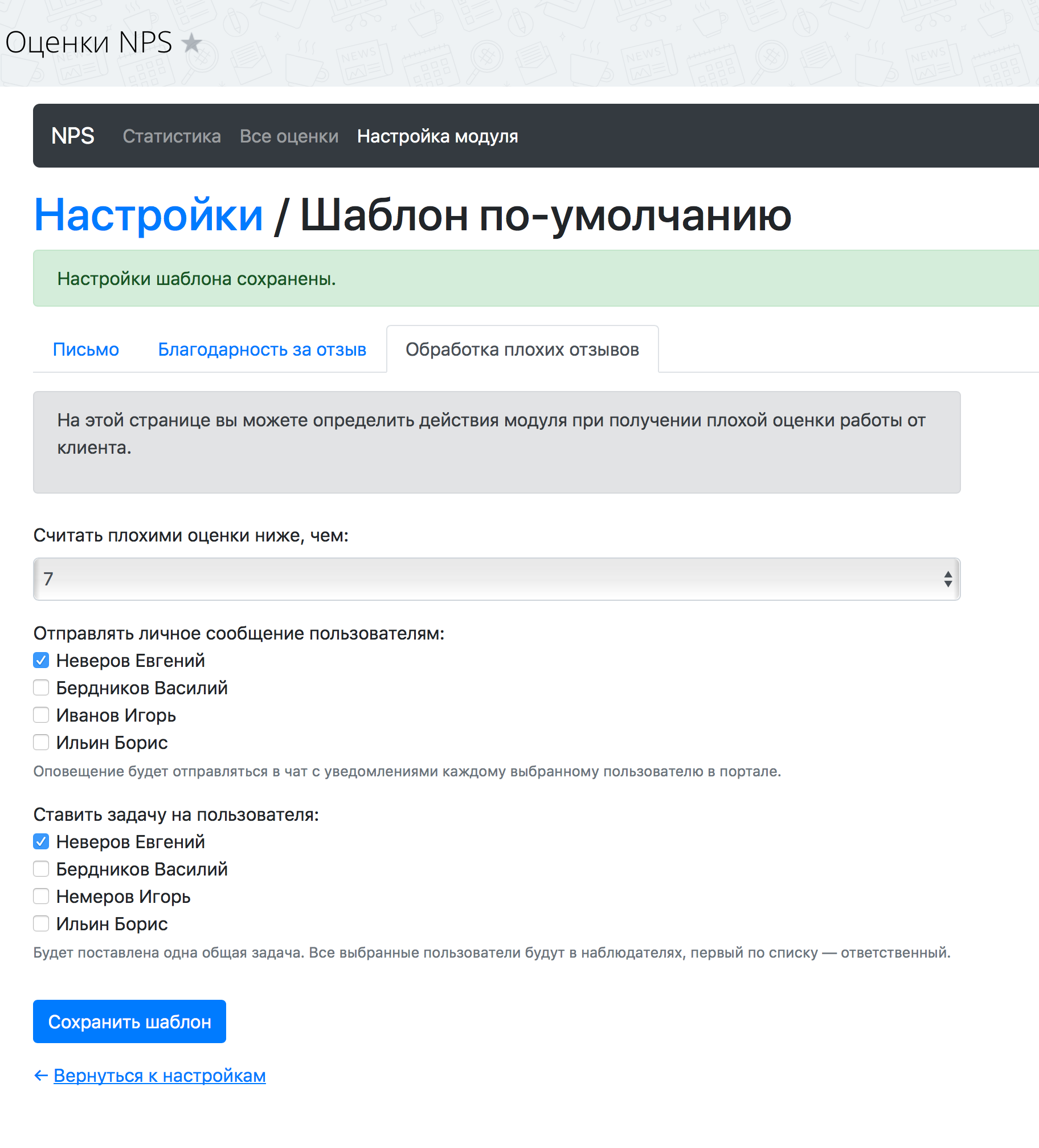 В настройках модуля можно указать особое поведение для плохих оценок: вы можете сделать автоматическое оповещение сотрудников о плохой оценке, а также выставление задачи на ответственного сотрудника — чтобы он мог разобраться с причиной проблемы и исправить ситуацию.