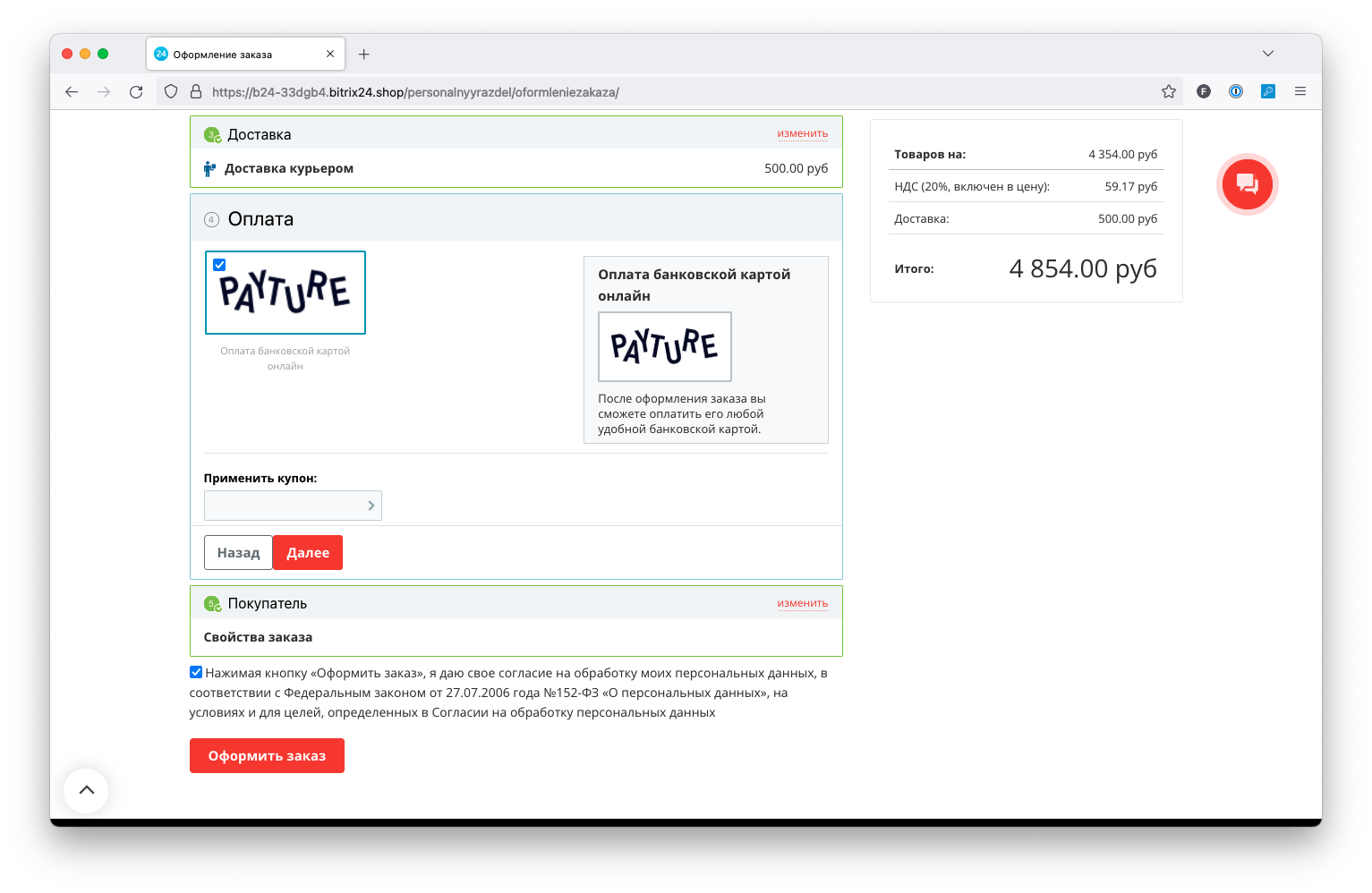 Интеграция с интернет-эквайрингом Payture.ru для приёма онлайн-платежей с банковских карт Visa, MasterCard, MIR (Мир), JCB