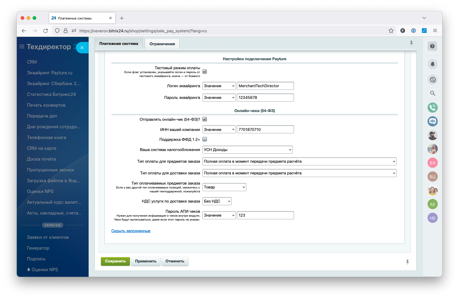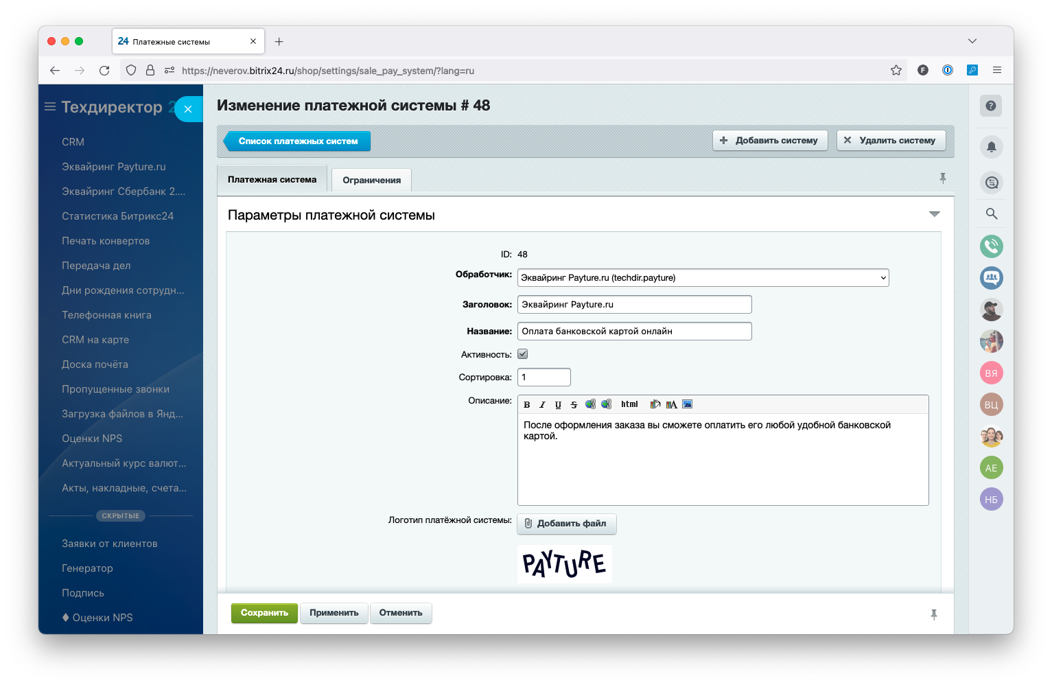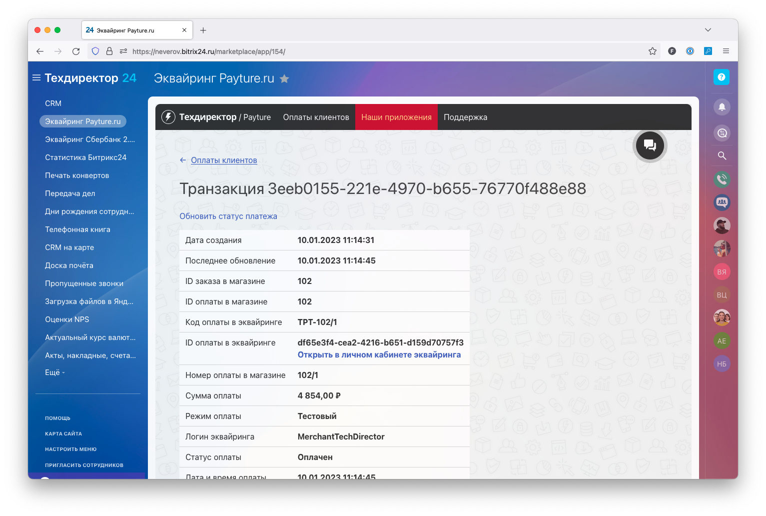 Приложение позволяет в автоматическом режиме принимать оплату заказов в интернет-магазинах Битрикс24 и счетах CRM банковскими картами Visa, MasterCard, UnionPay, JCB, Мир.