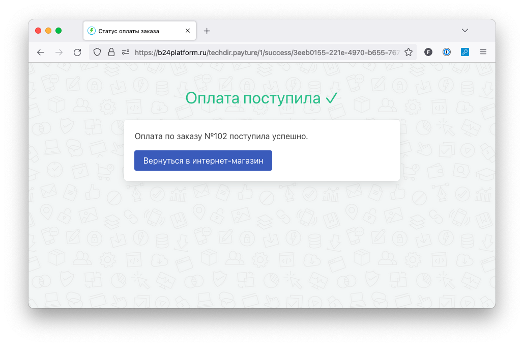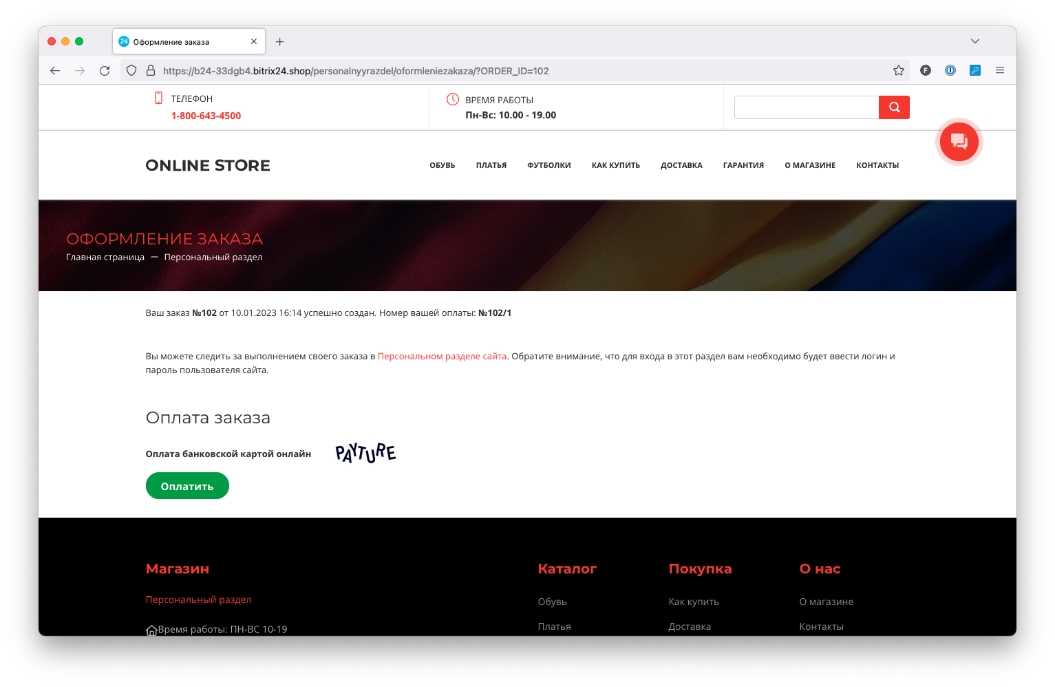 Если у вас разработан интернет-магазин на платформе Битрикс24.Магазины, онлайн-оплата будет автоматически доступна при оформлении заказа в магазине. Состав заказа автоматически попадёт в онлайн-чек. После оплаты в информации о заказе появится знак оплаты.
