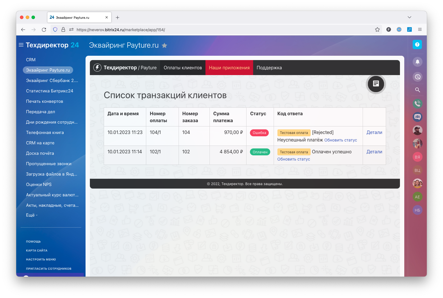 - Автоматическое изменение статуса заказа/сделки в зависимости от статуса проведения платежа.