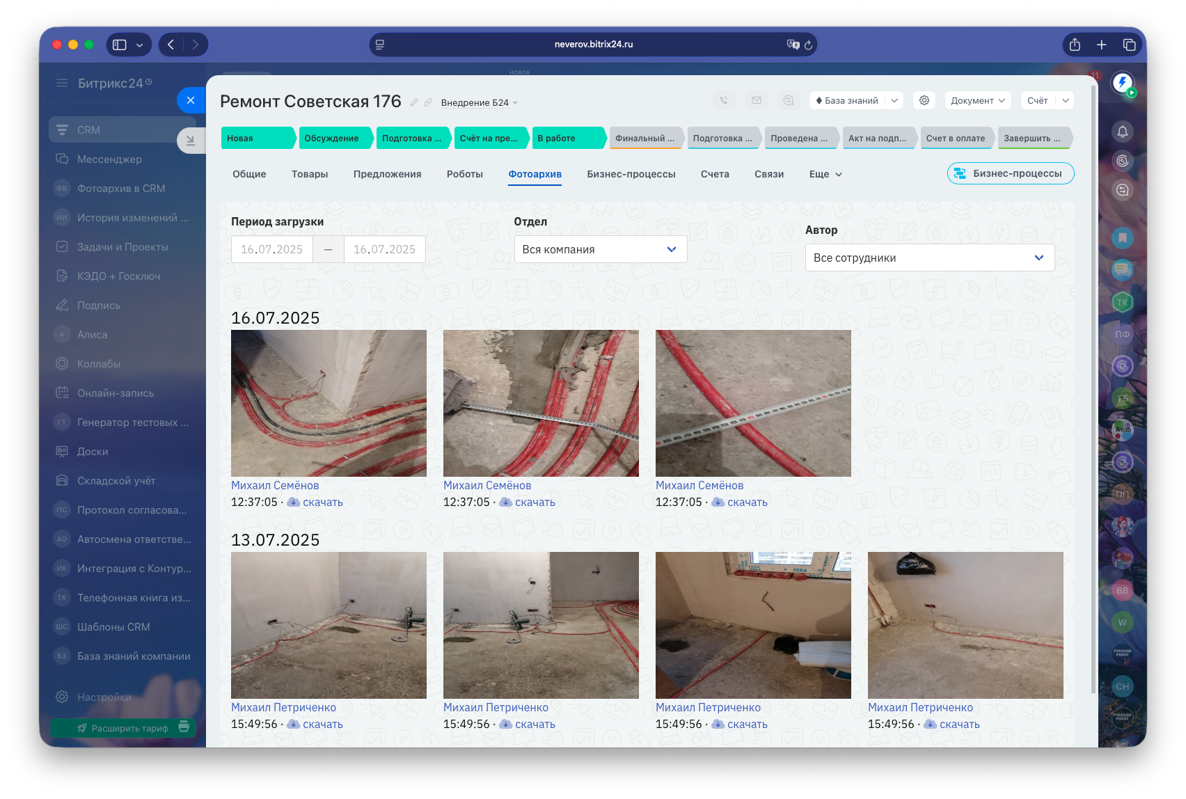 Все зафиксированные таким образом фотографии в дальнейшем можно просмотреть во вкладке «Архив фотографий» на страничке объекта CRM или смарт-процесса, причём фотографии вы сможете отфильтровать по периоду загрузки, автору или отделу компании.
