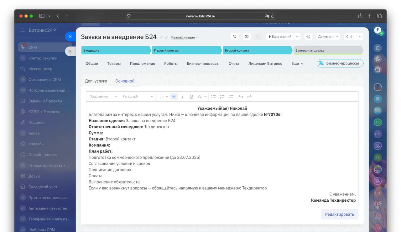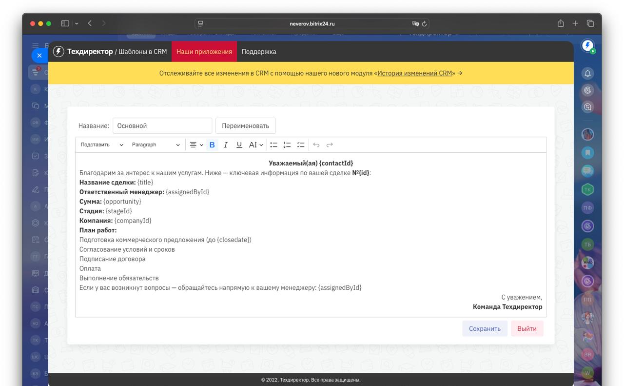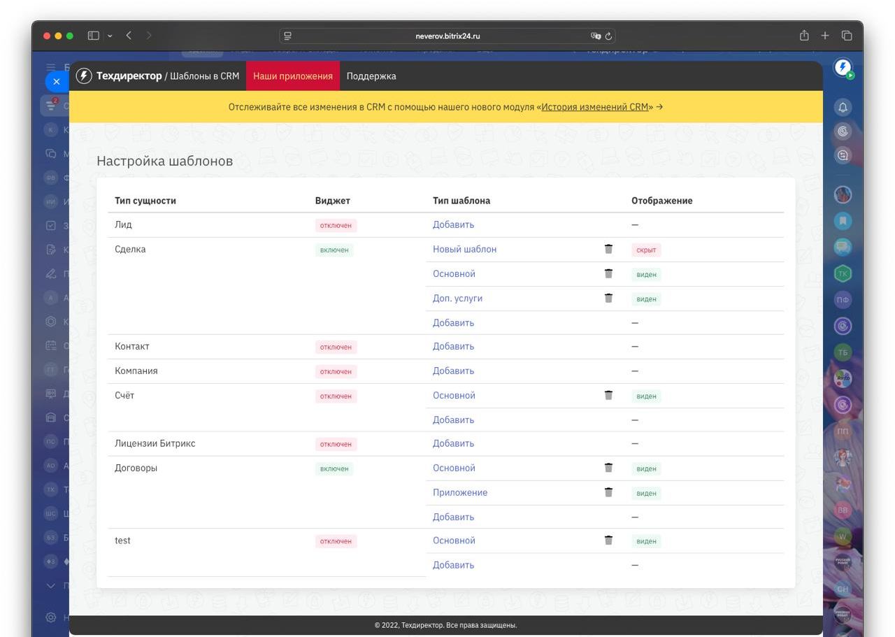 Новый модуль расширяет возможности CRM и позволяет создавать неограниченное количество шаблонов для любых сущностей — сделок, контактов, компаний, смарт-процессов и других элементов.