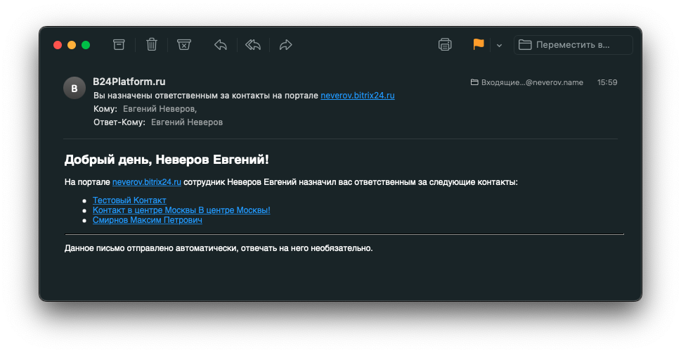 Получатели объектов в обязательном порядке получат уведомление на электронную почту о том, что они теперь несут ответственность за новые лиды, сделки, компании и контакты, увидят весь список своих новых клиентов, смогут вовремя среагировать на это.