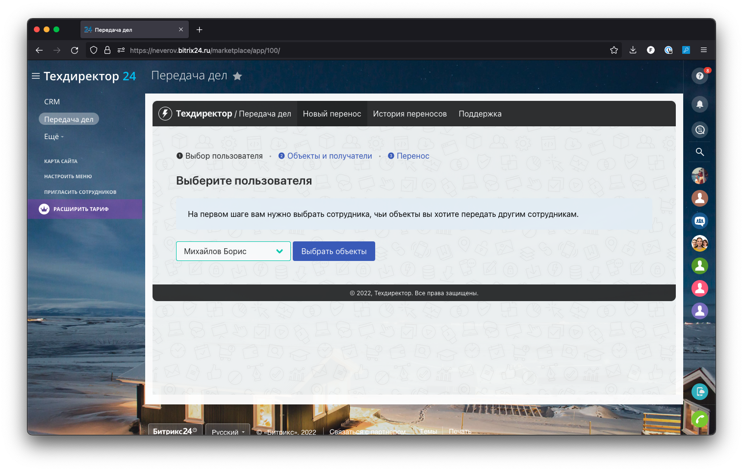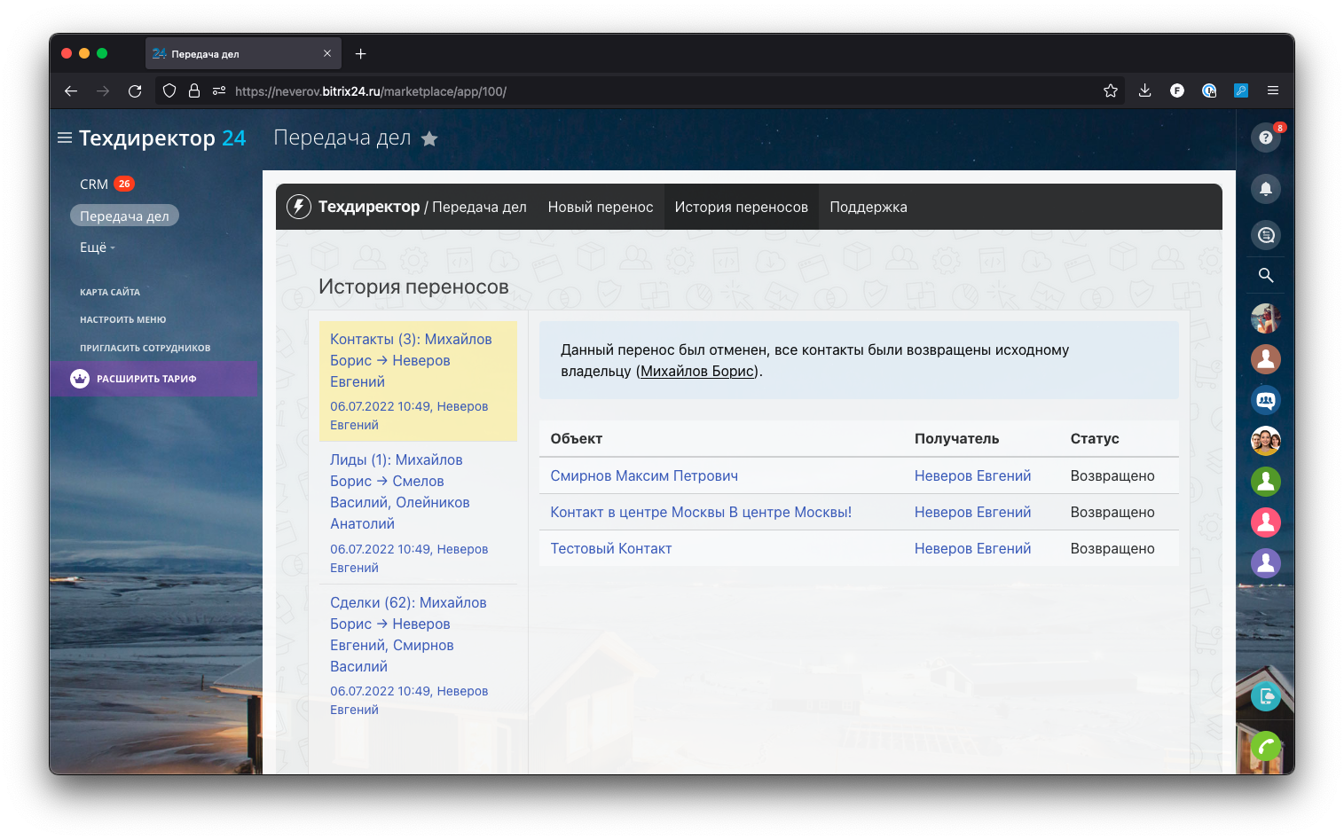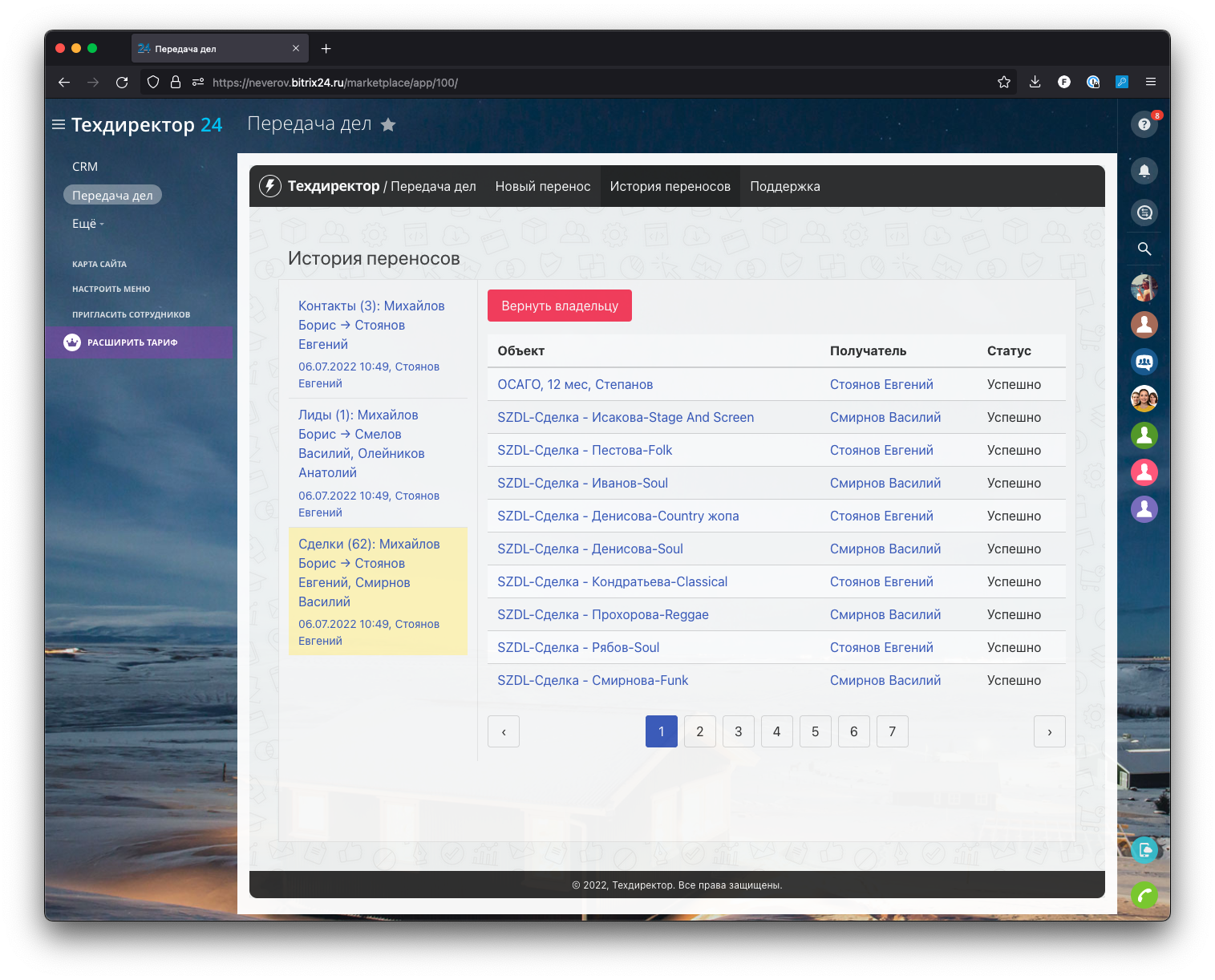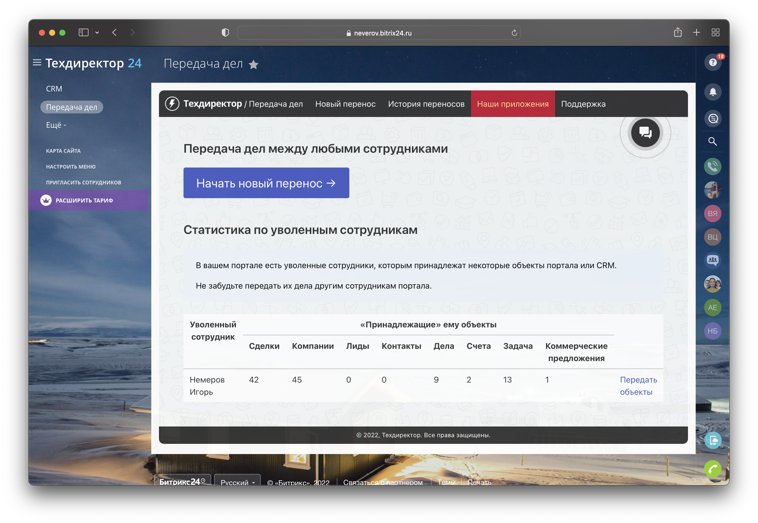 Передача дел — универсальное приложение для Битрикс24, которое позволяет в два клика сменить ответственного сотрудника у объектов CRM: