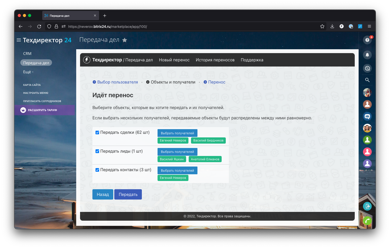 При передаче вы можете выбрать не одного получателя, а сразу нескольких — тогда передаваемые объекты будут равномерно распределены между всеми получателями. Естественно, что разные объекты могут быть переданы разным ответственным (скажем, лиды — одному сотруднику, а сделки — другому).